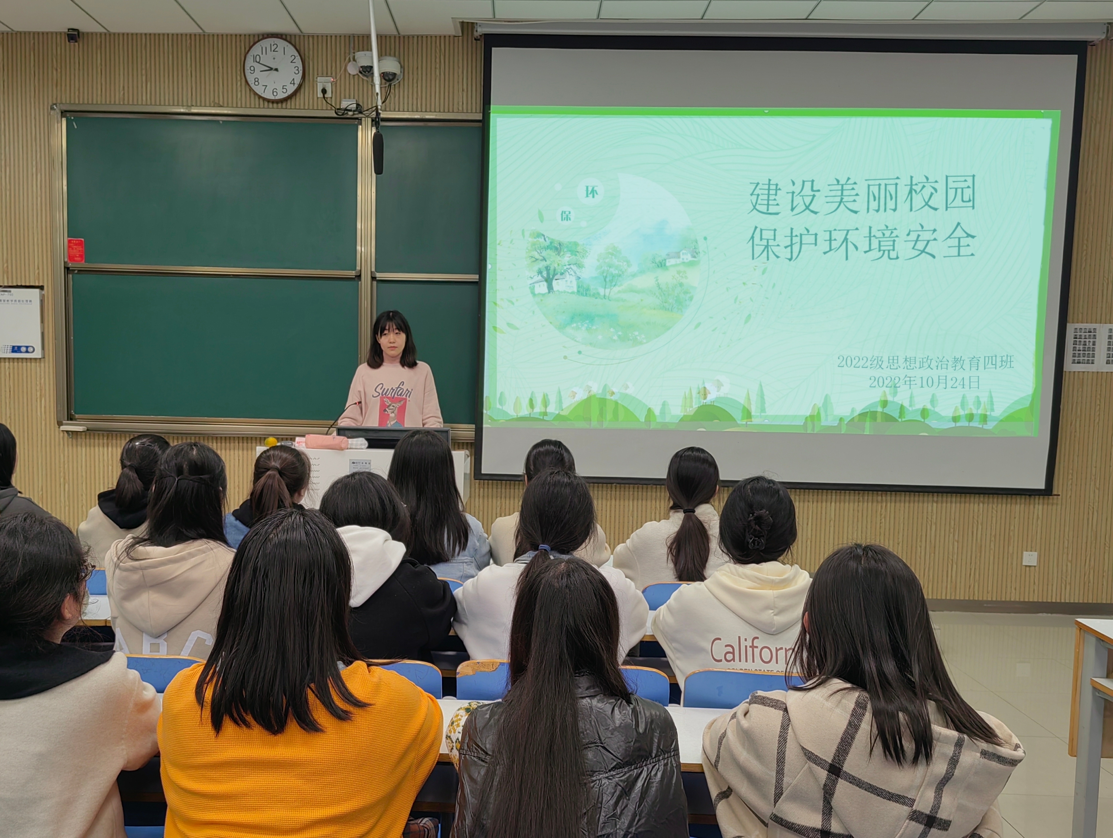 为贯彻绿色发展理念,提高同学们的环保意识,10月24日下午,永利集团官网2022级思想政治教育四班在社科楼515教室召开“建设美丽校园,保护环境安全”主题班会。会议由文体委员周可盈主持。
