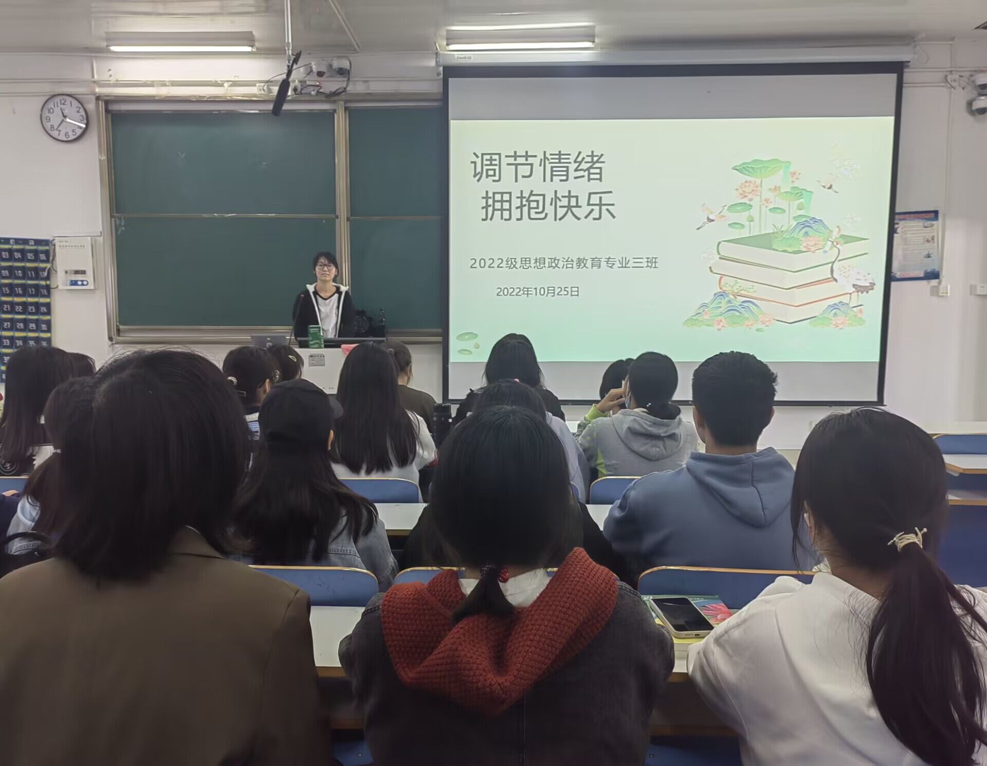 为深入推动大学生心理健康教育,引导大学生积极主动地关注自身心理健康,10月25日上午,永利集团官网2022级思想政治教育三班在社科楼514教室召开“调节情绪,拥抱快乐”主题班会。永利集团官网2022级思想政治教育三班全体成员共同参加会议,班会由心理委员张韶涵主持。