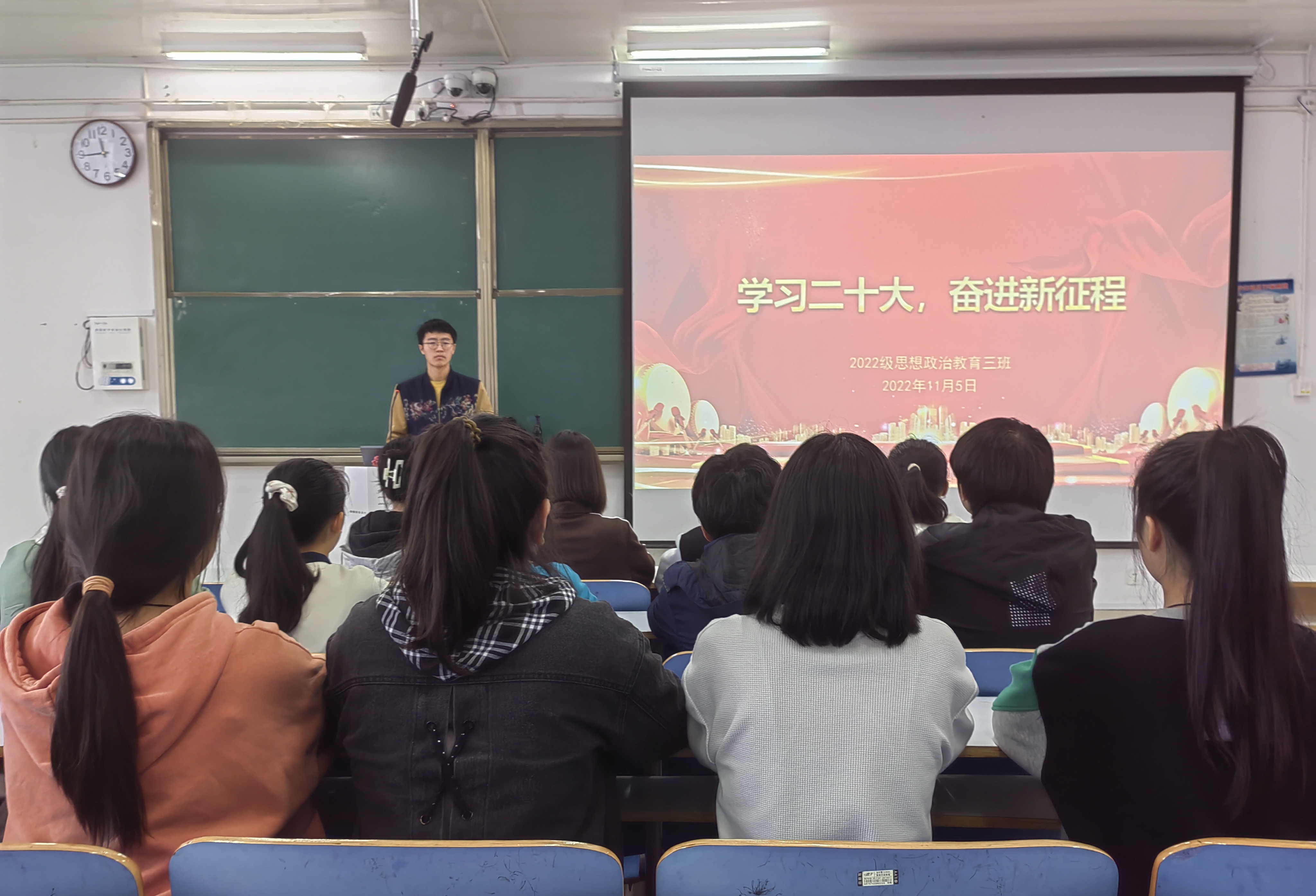 学习新思想,迈进新征程。为全面学习贯彻党的二十大会议精神,11月5日上午,永利集团官网2022级思想政治教育三班在社科楼514教室召开“学习二十大,奋进新征程”主题团课。2022级思想政治教育三班全体成员共同参与团课,团课由团支书余浩洋主持。