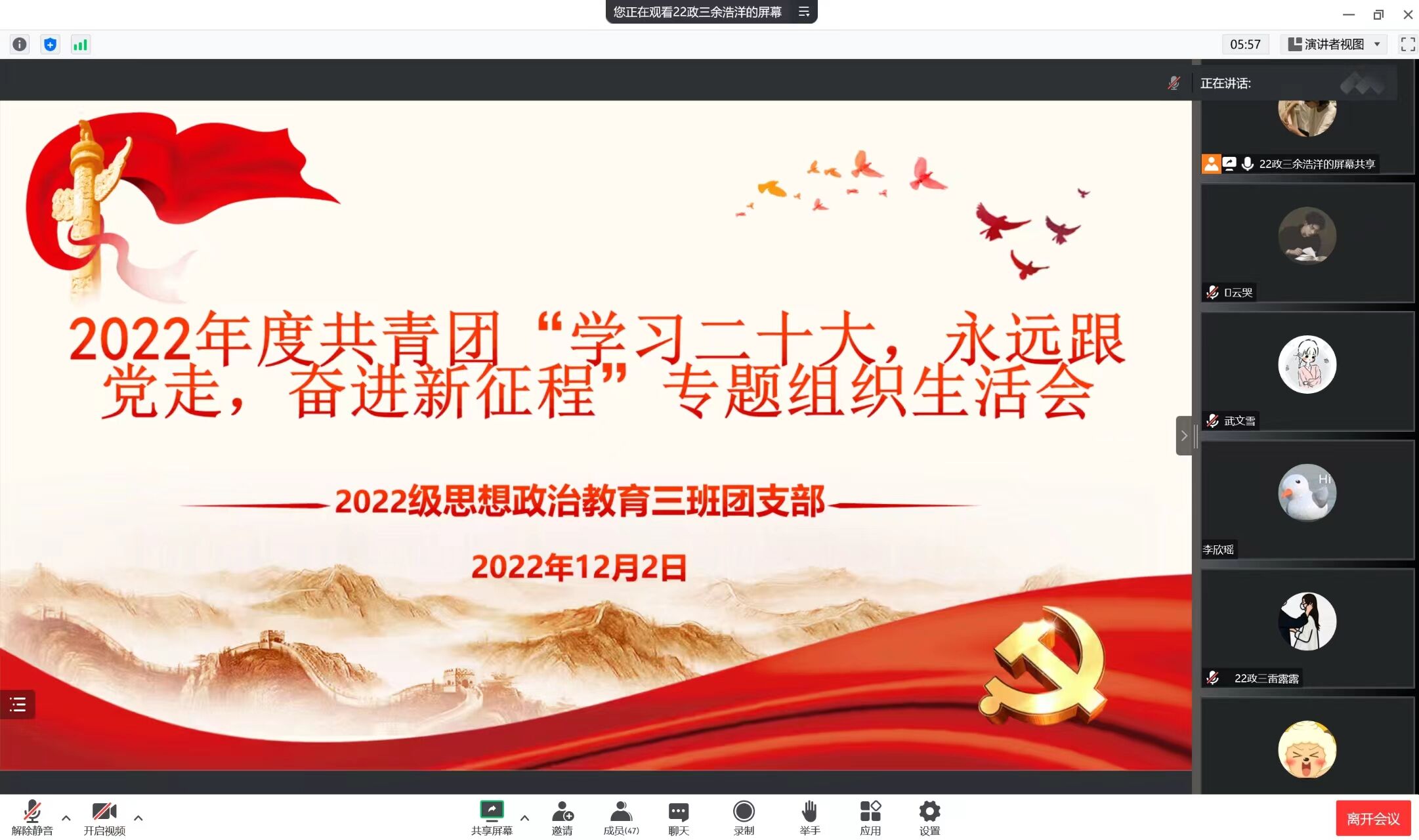 为帮助团员在学习工作中发现问题、解决问题,12月2日下午,永利集团官网2022级思想政治教育三班在线上开展“学习二十大,永远跟党走,奋进新征程”专题组织生活会。永利集团官网2022级思想政治教育三班班主任吴梦云和三班全体团员共同参加此次专题组织生活会,生活会由团支书余浩洋主持。
