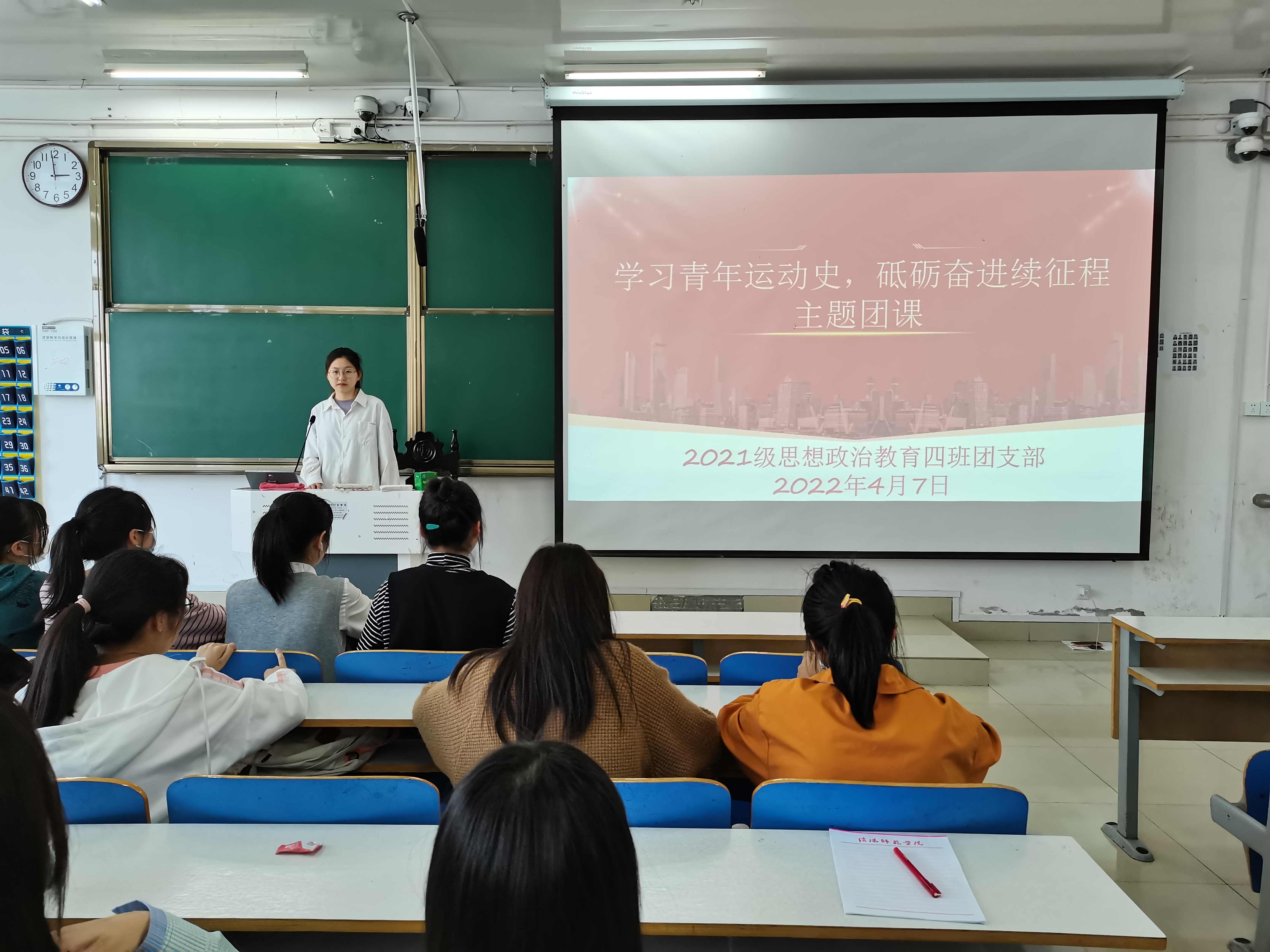 4月7日下午,永利集团官网2021级思想政治教育四班在社科楼516教室开展“学习青年运动史,砥砺奋进绪征程”主题团课。2021级思想政治教育四班全体团员共同参与本次团课,团课由团支书刘珂含主持。