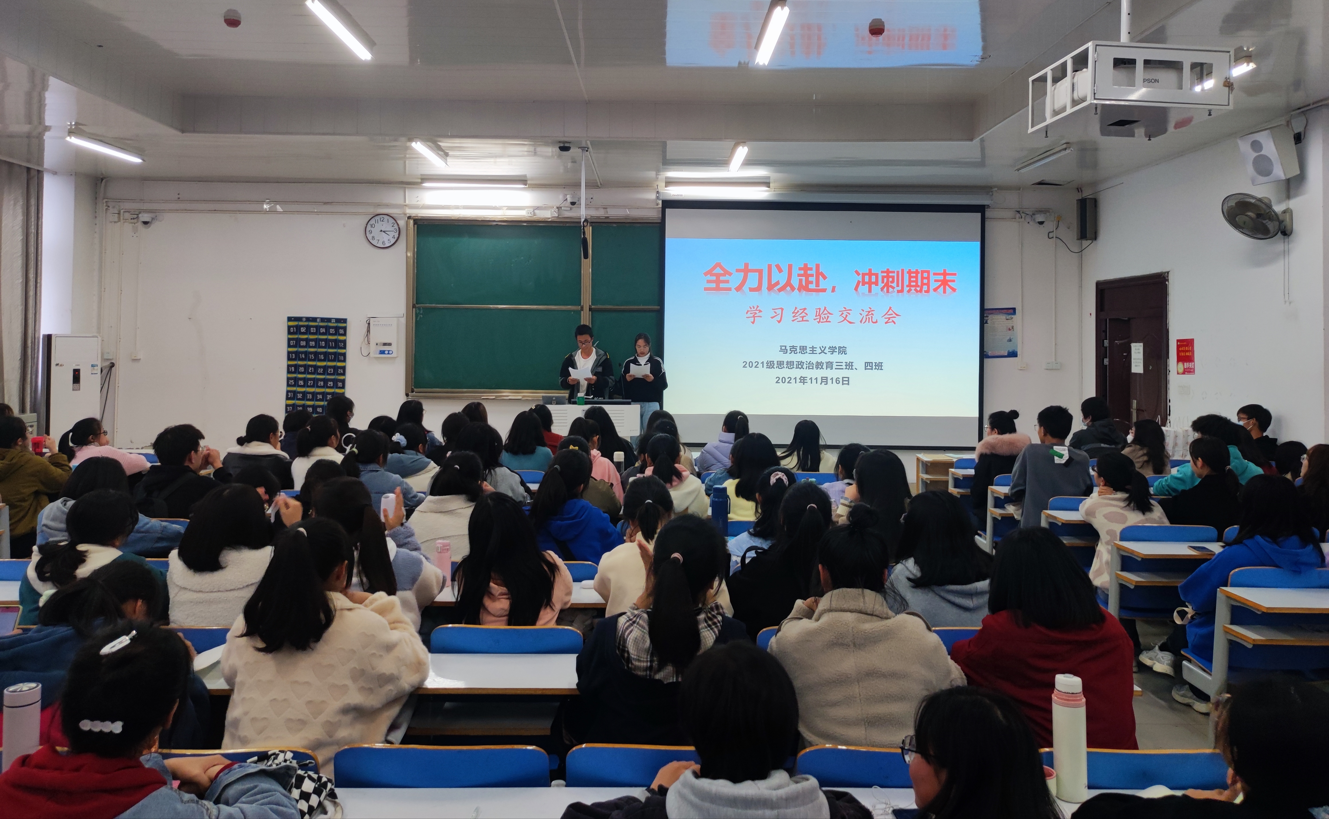 为进一步激发同学们的学习积极性,改进学习方法,帮助同学们更好的明确学习目标,11月16日下午,永利集团官网2021级思想政治教育三班、四班在社科楼515教室开展学习经验交流会。班主任高小佳、2020级优秀学生代表以及2021级思想政治教育三班、四班全体同学参加了本次班会。班会由学习委员于坤鹏、史恪萍主持。