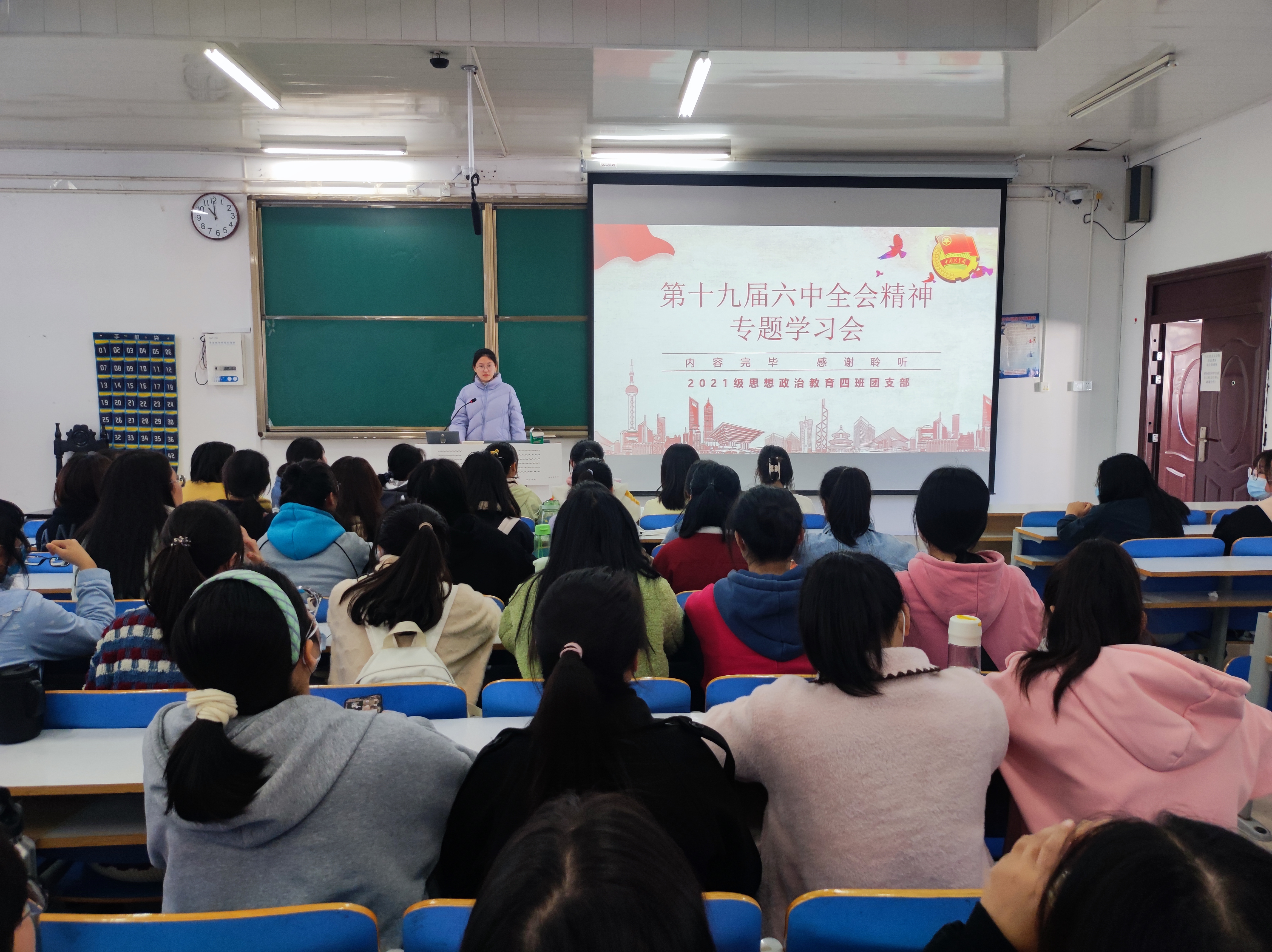 11月18日下午,永利集团官网2021级思想政治教育四班在社科楼514教室召开十九届六中全会精神专题学习会,2021级思想政治教育四班全体同学参加了本次专题学习会。专题学习会由团支书刘珂含主持。