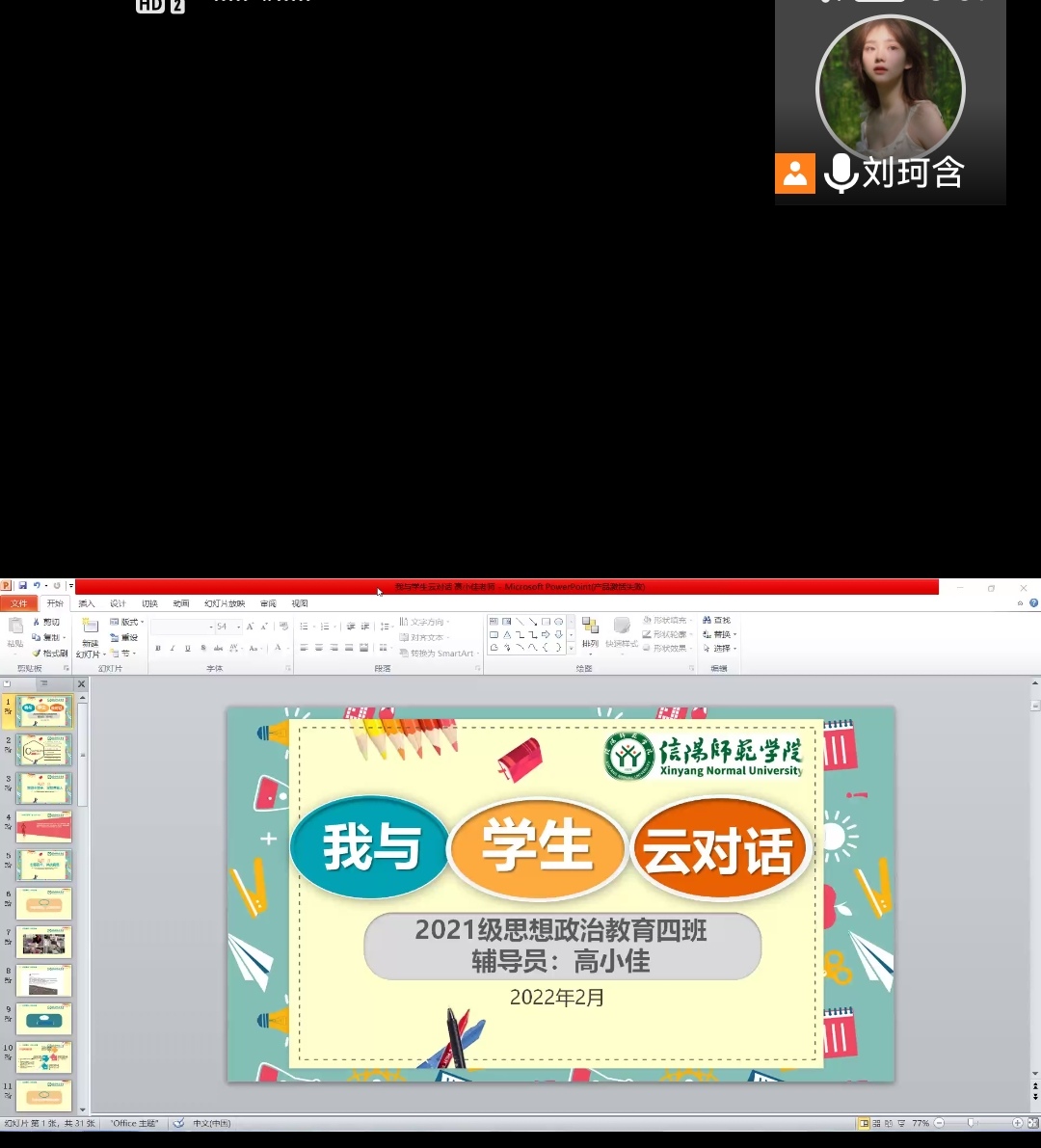 2月12日下午,永利集团官网2021级思想政治教育四班开展“我与学生云对话”线上会议。辅导员高小佳及2021级思想政治教育四班全体同学共同参与本次活动。活动由团支书刘珂含主持。