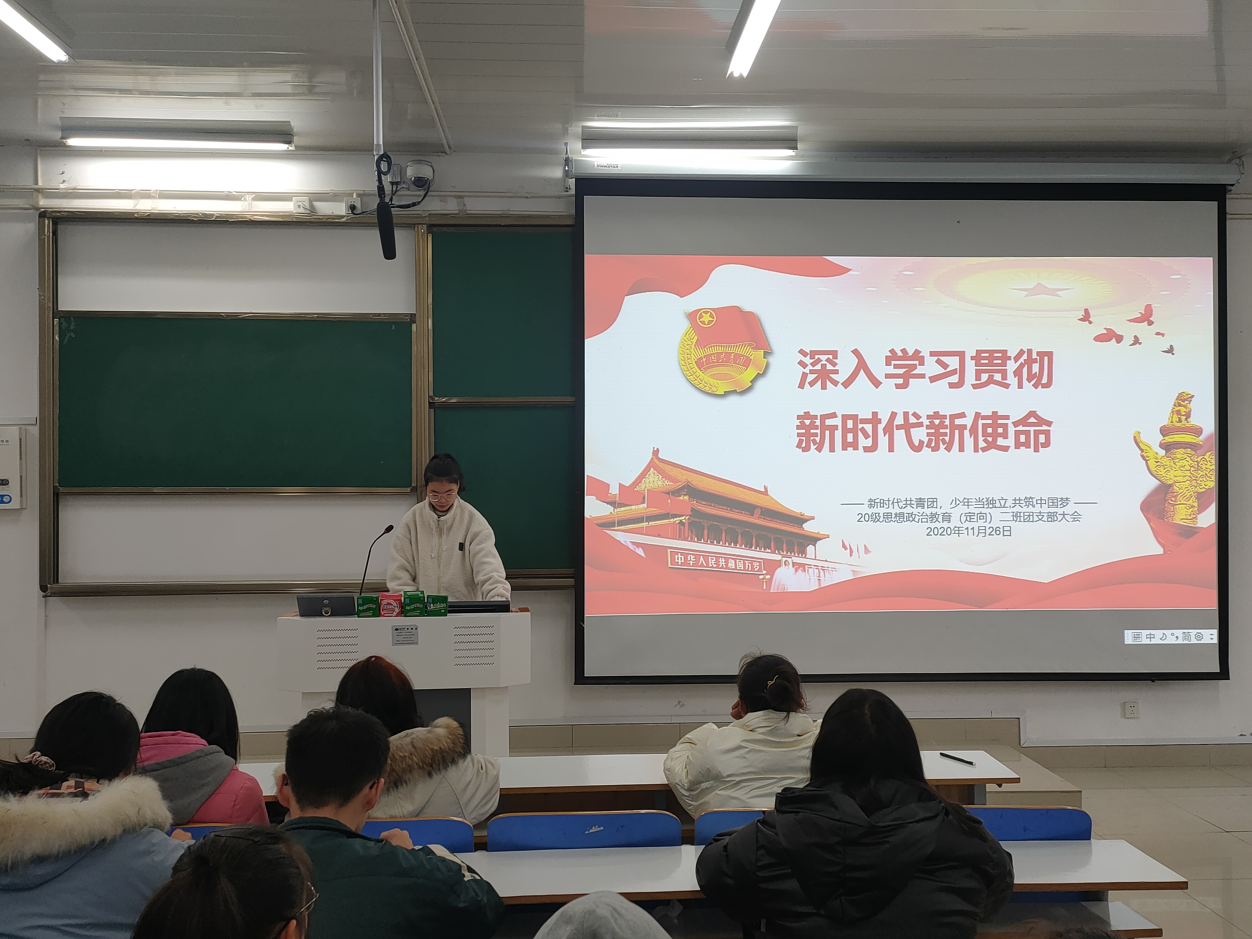为促进同学们深入学习共青团知识,自觉担当新时代新使命,11月26日,永利集团官网2020级思想政治教育定向二班“担当新使命,共筑中国梦”主题团支部大会在社科楼514教室顺利召开。定向二班全体团员参与此次会议。大会由团支书李晨曦主持。