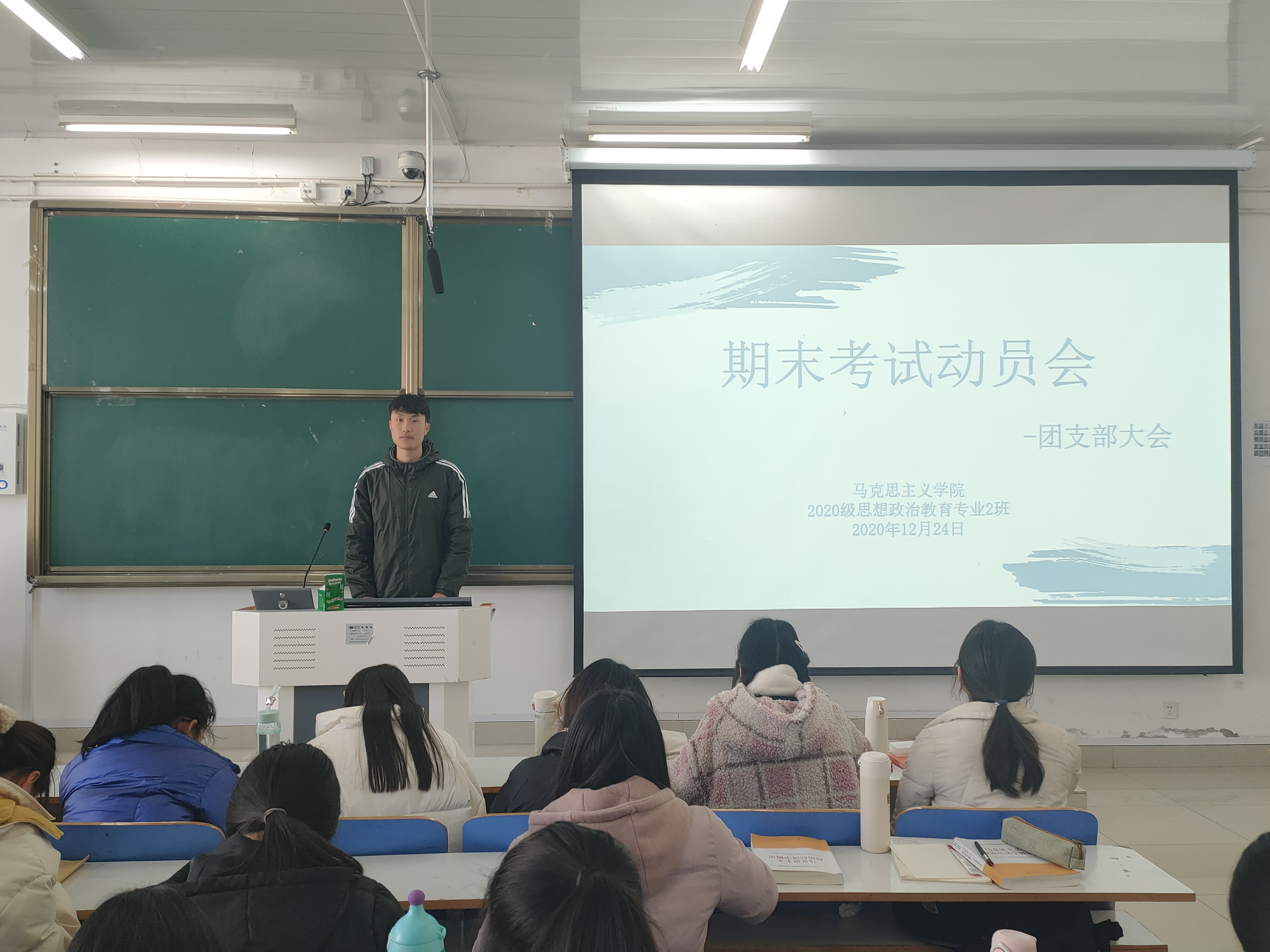12月24日上午,永利集团官网2020级思想政治教育二班、(定向)二班在社科楼516教室顺利召开期末考试动员会。2020级思想政治教育二班、(定向)二班全体学生共同参与此次会议。会议由李晨曦、陈宇航主持。