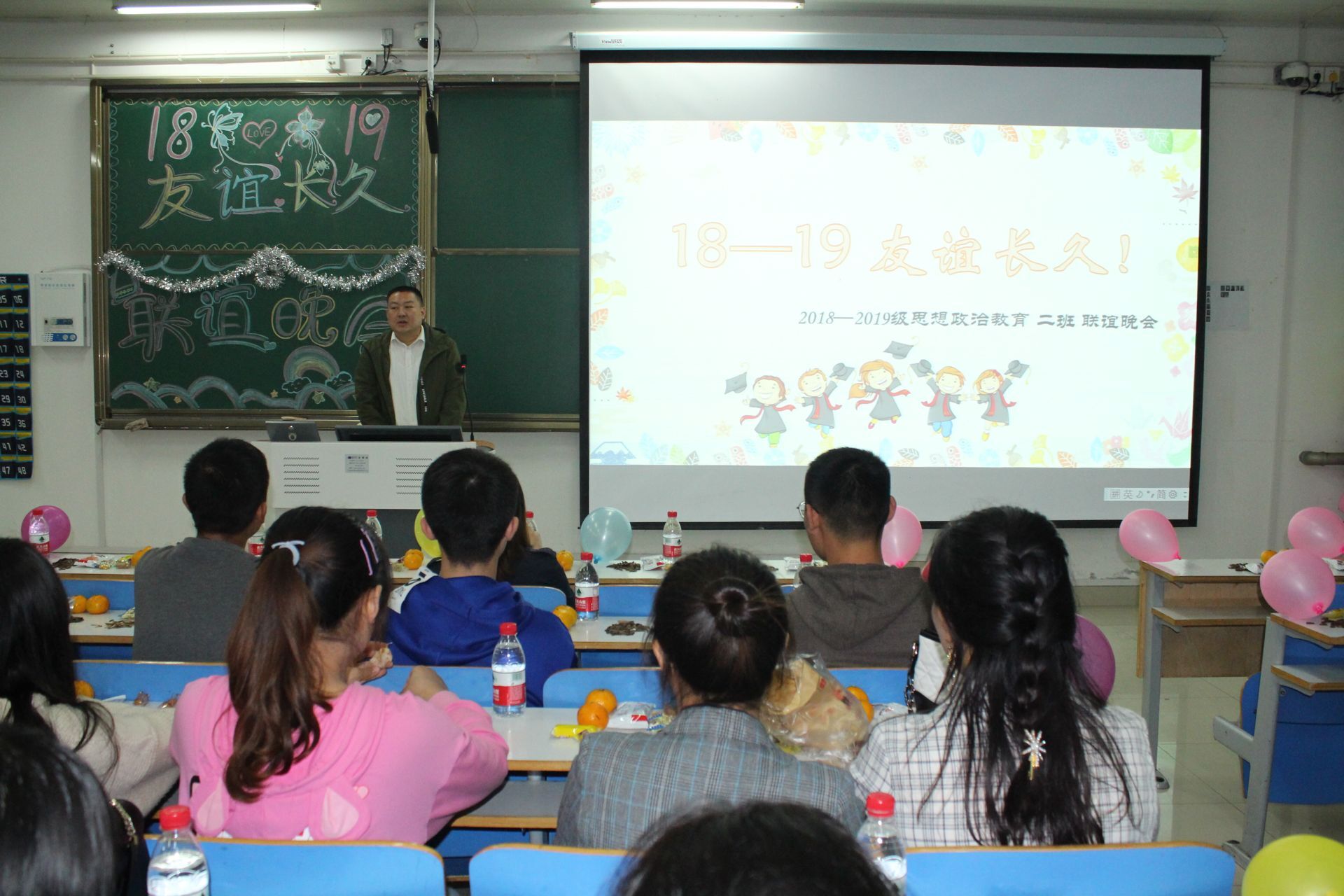 10月20日晚,永利集团官网“18、19友谊长久”思想政治教育二班联谊晚会在社科楼516教室隆重举行。永利集团官网党委副书记何晓坚、团委老师陶青青及2018、2019级思政二班全体学生共同观看了本场晚会。晚会由张靖茹、吕昂主持。