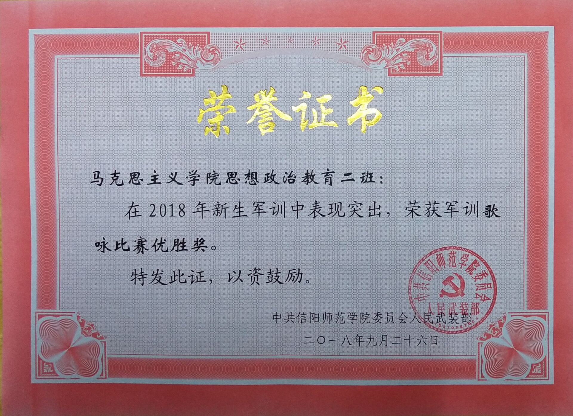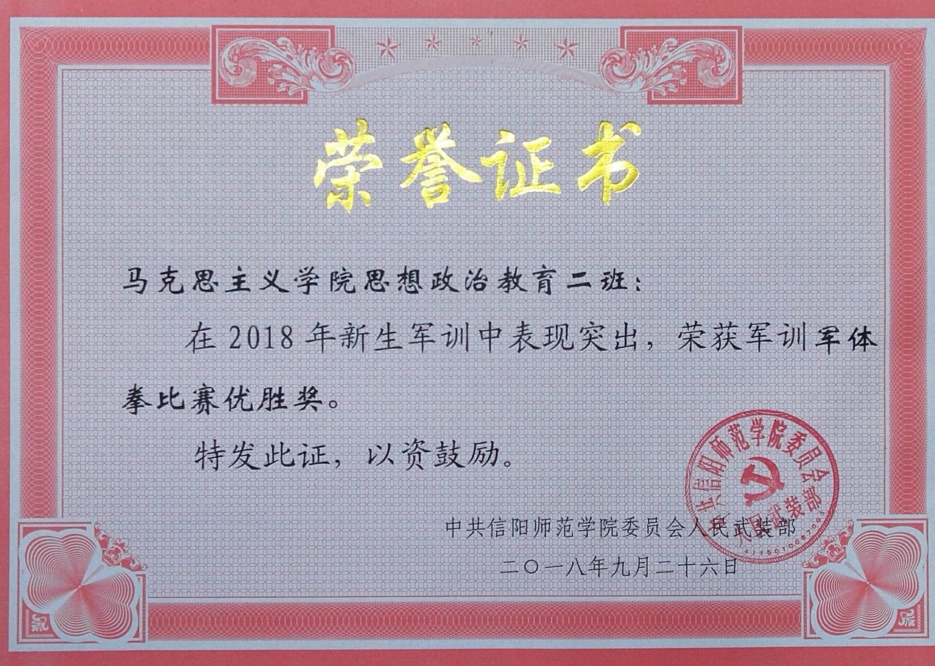 红旗猎猎,军歌嘹亮。9月26日上午,信阳师范学院2018级新生军训成果检验暨表彰大会在西操场召开。我校领导和教官们检阅了各军训方阵。在检阅过程中,由永利集团官网的新生组成的军训受阅方队迈着整齐的步伐,喊着响亮的口号,个个军容整肃,雄姿英发,充分展示了2018级永利集团官网新生昂扬向上的精神面貌。接着,全体2018级新生进行唱军歌、打军体拳等科目展示,展现了同学们的军训成果,尽显高昂士气。在表彰大会上,永利集团官网2018级思想政治教育二班荣获军训歌咏比赛优胜奖和军体拳比赛优胜奖。除此,杨康、黄子晋被授予军训先进个人的称号。