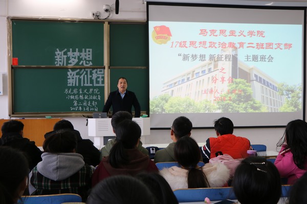 为让学生树立远大目标,合理规划大学生活, 3月20日下午,校团委书记王建旭在社科楼515教室召开了2017级思想政治教育二班团支部 “新梦想,新征程”主题系列团日活动。永利集团官网团委书记曹栋、团支部成员共同参加,活动由班级辅导员孙绪曙主持。