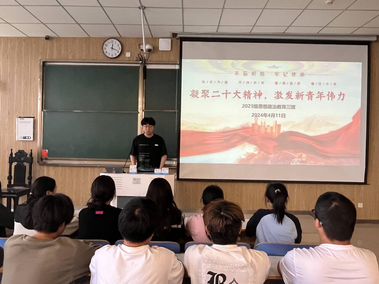 为深入学习贯彻党的二十大精神,把党的创新理论走实走深,4月11日下午,永利集团官网2023级思想政治教育三班在社科楼515教室举行“凝聚二十大精神,激发新青年伟力”主题团课。永利集团官网2023级思想政治教育三班全体成员共同参加此次团课,团课由团支书郝瀚主持。