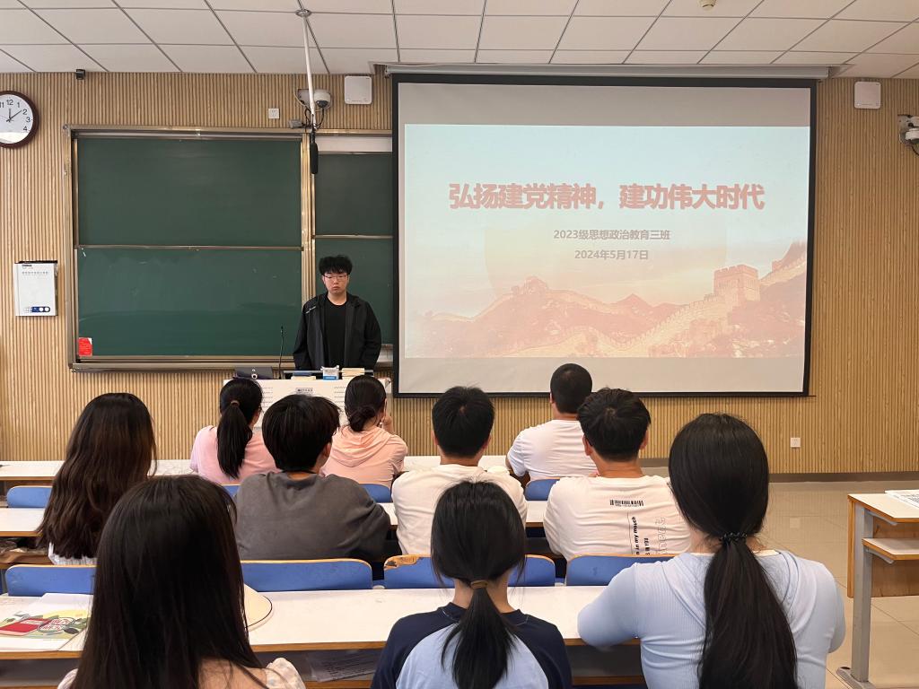 为弘扬伟大建党精神,走好新时代赶考之路,5月17日上午,永利集团官网2023级思想政治教育三班在社科楼515召开“弘扬建党精神,建功伟大时代”主题团课。永利集团官网2023级思想政治教育三班全体同学共同参与本次团课,团课由团支书郝瀚主持。