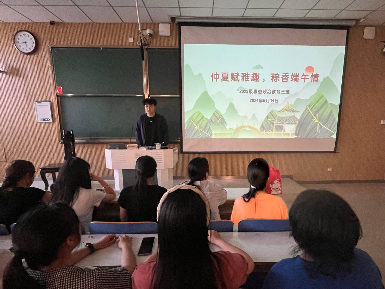 为深入了解端午节的文化背景,6月14日上午,永利集团官网2023级思想政治教育三班在社科楼515召开“仲夏赋雅趣,粽香端午情”主题班会。永利集团官网2023级思想政治教育三班全体同学共同参与本次班会,班会由团支书郝瀚主持。