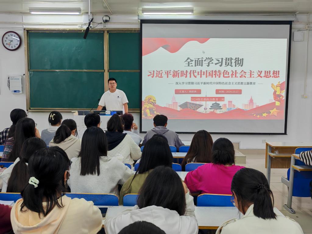 为了深入学习领会习近平新时代中国特色社会主义思想,不断增进青年学生对党创新理论的政治认同,永利集团官网2024级思想政治教育三班于10月17日下午在社科楼515教室举办“深入学习贯彻习近平新时代中国特色社会主义思想”主题团课活动。本次团课活动由团支书杨迎滨主持。