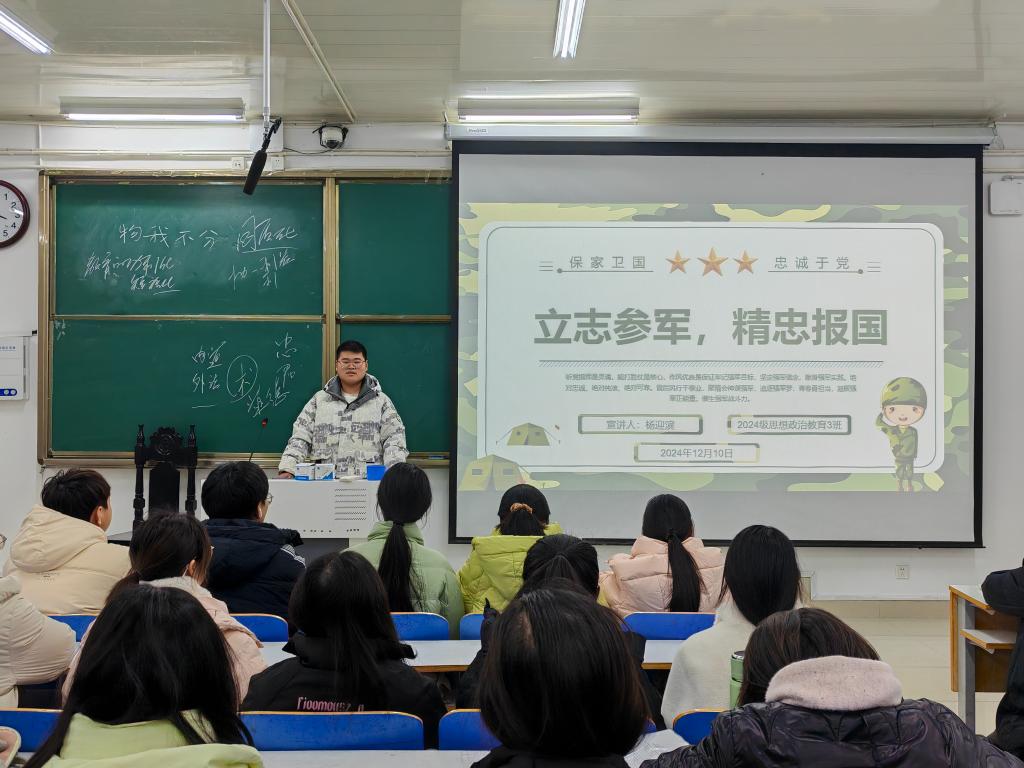 为积极响应国家号召,增强青年学生的国防意识与爱国情怀,永利集团官网2024级思想政治教育三班于12月10日在社科楼514教室成功举办了以“立志参军,精忠报国”为主题的班会活动。此次班会由班长杨迎滨主持。
