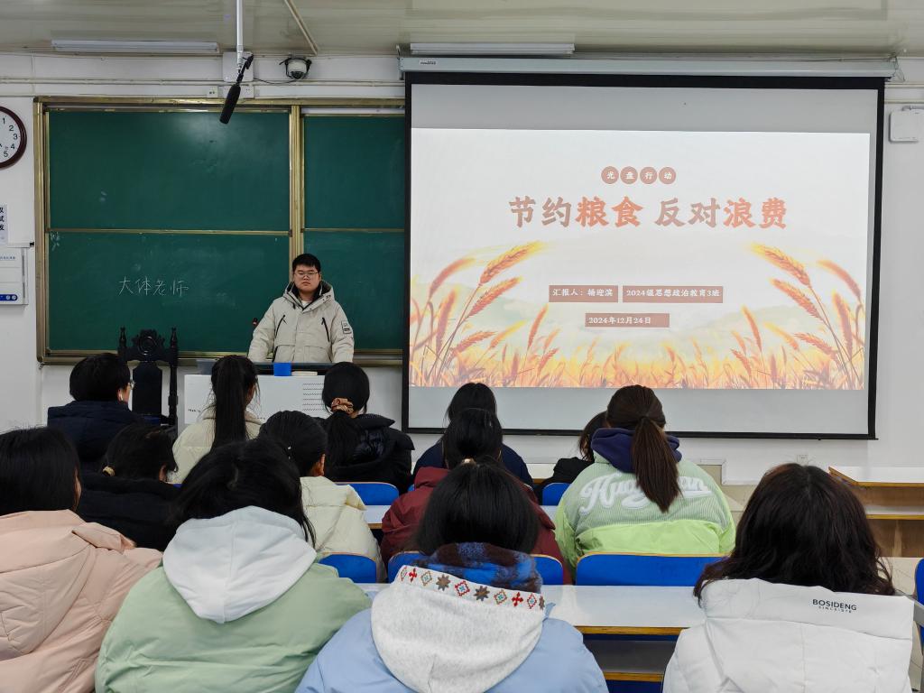 为引导学生们树立珍惜粮食的意识,养成勤俭节约的好习惯,永利集团官网2024级思想政治教育三班于12月24日在社科楼514教室成功召开了一场以“节约粮食,反对浪费”为主题的班会活动。