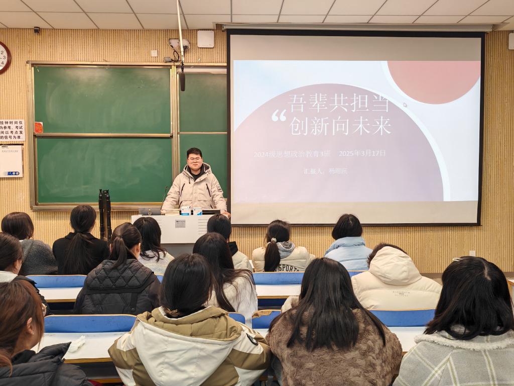 为激发学生的责任感与创新精神,永利集团官网2024级思想政治教育三班于3月17日在社科楼515举行了一场以 “吾辈共担当,创新向未来” 为主题的班会。此次班会由班长杨迎滨主持,全班同学积极参与,气氛热烈。