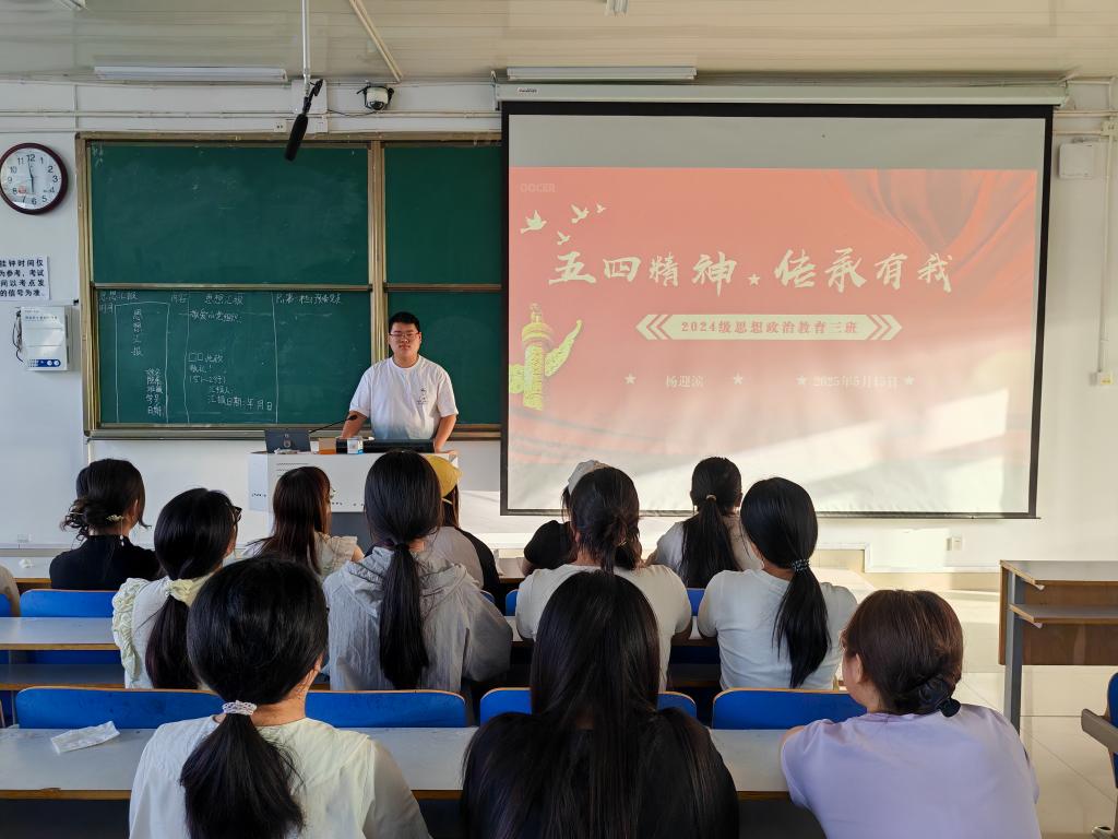 为深入学习贯彻五四精神,引导同学们坚定理想信念,永利集团官网2024级思想政治教育三班于5月15日在社科楼514开展了“五四精神,传承有我”主题团课活动。本次团课由团支书杨迎滨主持,三班全体同学参与。