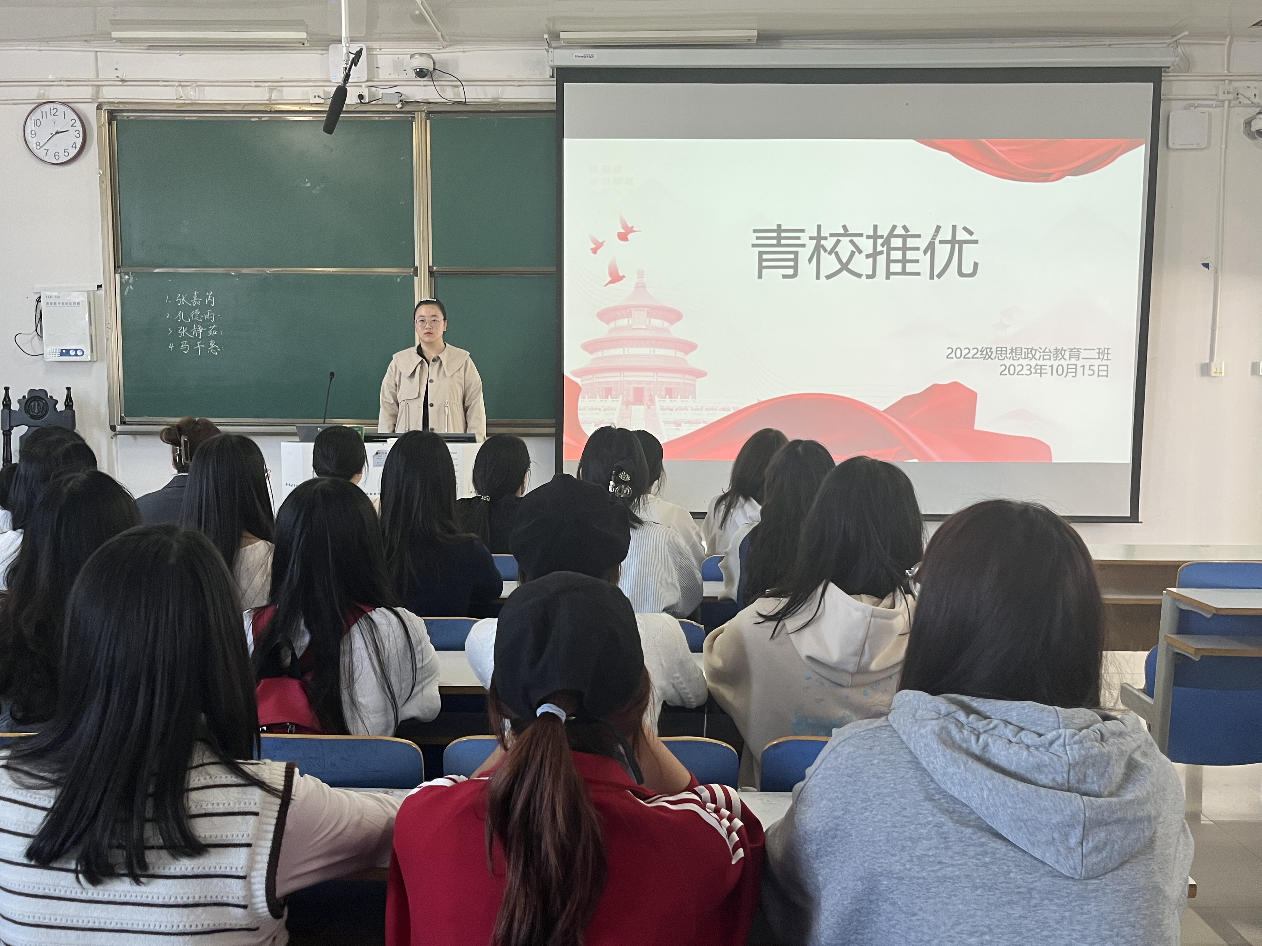 会议伊始,李佳音重申了青年共产主义学校推优的范围、条件及程序等,她指出,推优工作不仅可以向党组织输送新鲜的血液,让党更加充满青春活力,同时对班级思想建设工作也起到了良好的推动作用。随后,8位候选人依次进行发言,其中,闫乐佳围绕思想品德、专业学习、个人生活等多个方面进行演讲,并多次引用“君子欲讷于言而敏于行”、“见贤思齐焉,见不贤而内自省”等名句,赢得了同学们的阵阵掌声。最后,李佳音组织班级同学进行不记名投票和唱票,并宣读最终结果。她强调,大家今后要继续坚持正确的思想和政治方向,加强理论学习、提高个人修养,学以致用、知行合一,努力向目标前进。