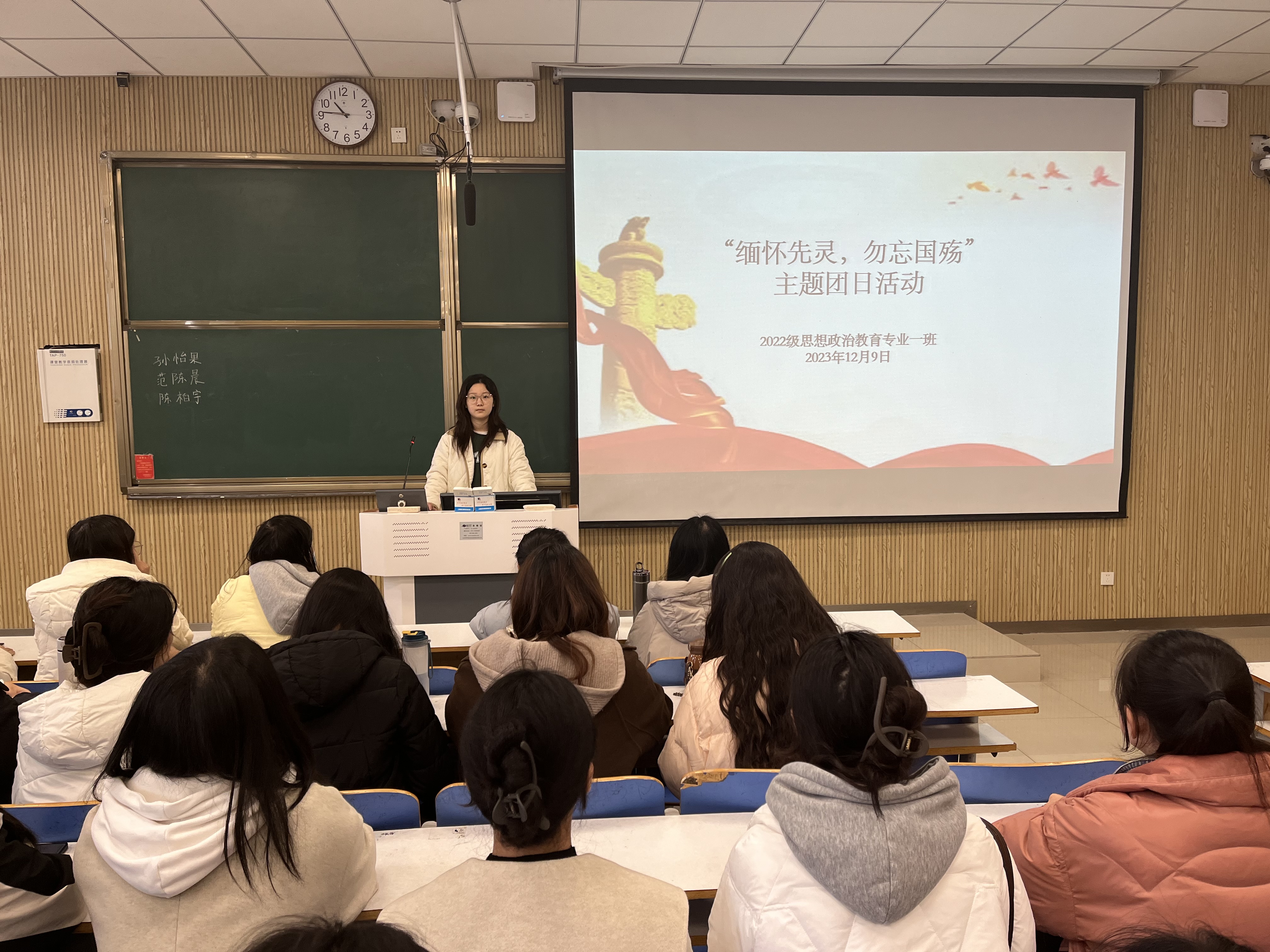 为推动同学们铭记历史,激发爱国热情,12月9日上午,永利集团官网2022级思想政治教育一班在社科楼515教室召开“缅怀先灵,勿忘国殇”主题团课。永利集团官网2022级思想政治教育一班全体同学共同参与本次团课,团课由团支书李佳茹主持。