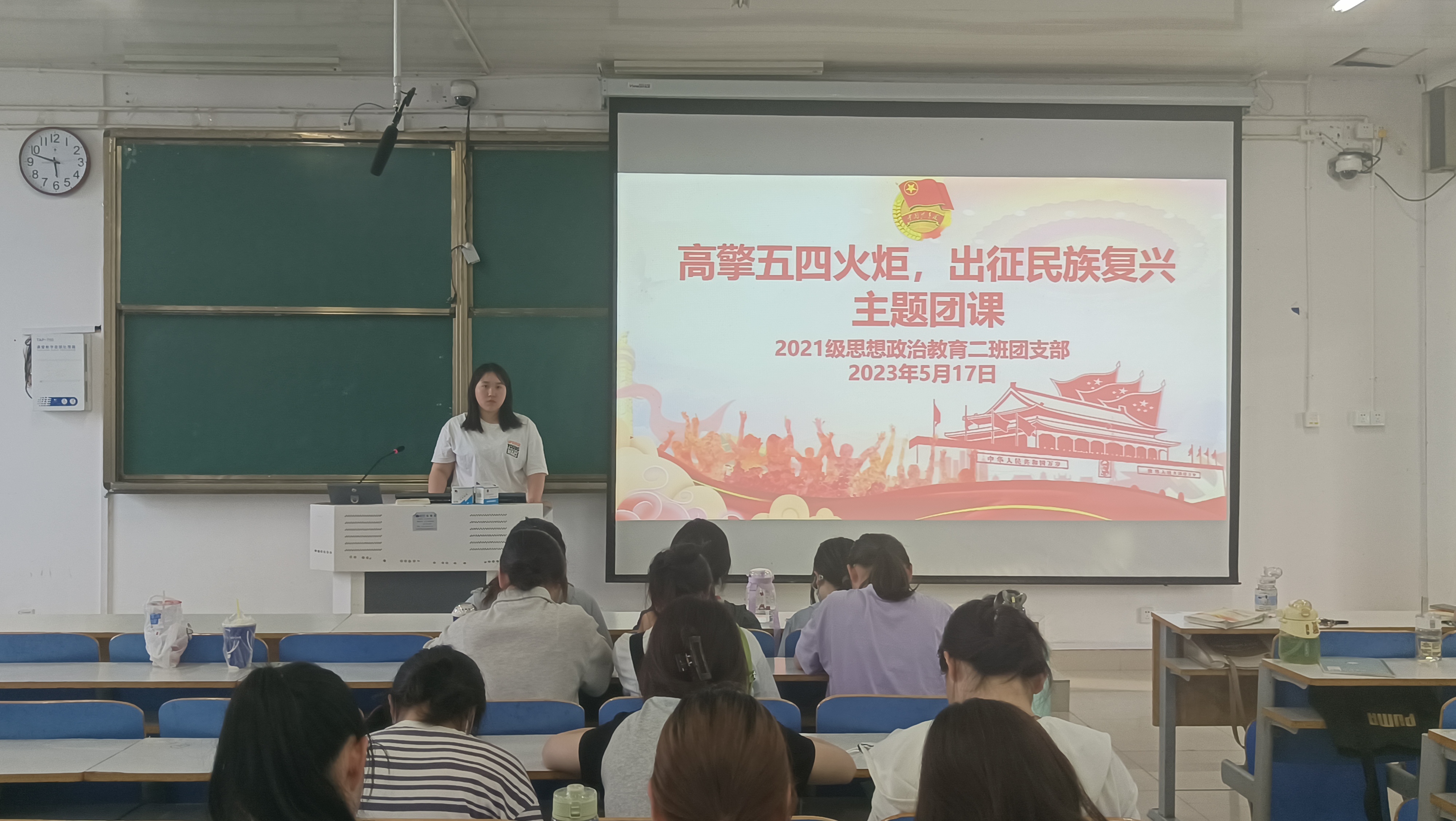 5月17日下午,永利集团官网2021级思想政治教育二班在社科楼514教室召开“高擎五四火炬,出征民族复兴”主题团课。2021级思想政治教育二班全体团员参加此次团课。团课由团支书王婧欣主持。