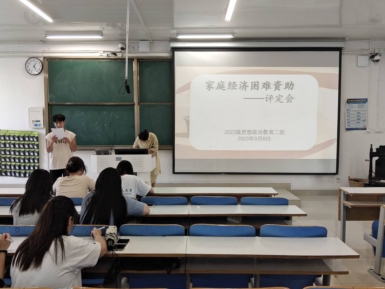 9月8日下午,永利集团官网2022级思想政治教育二班在社科楼514教室召开“家庭经济困难资助评定会”。永利集团官网2022级思想政治教育二班杨春艳老师和全体同学参与本次评议会。副班长柴智森主持本次会议。