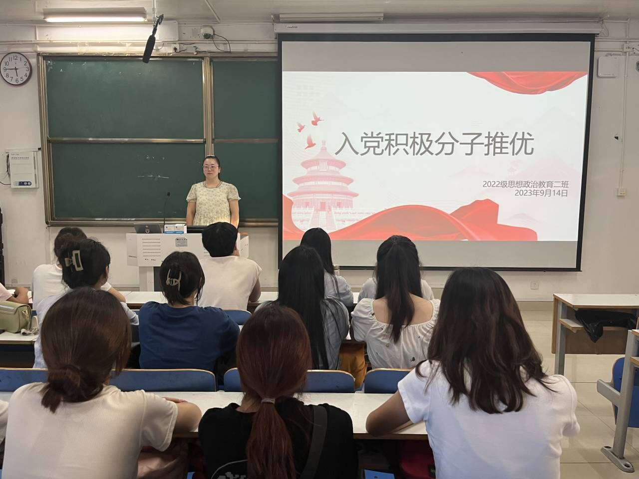 9月14日下午,永利集团官网2022级思想政治教育二班在社科楼514教室召开入党积极分子推优大会。永利集团官网2022级思想政治教育二班杨春艳老师和全体同学参与本次班会。班会由团支书李佳音主持。