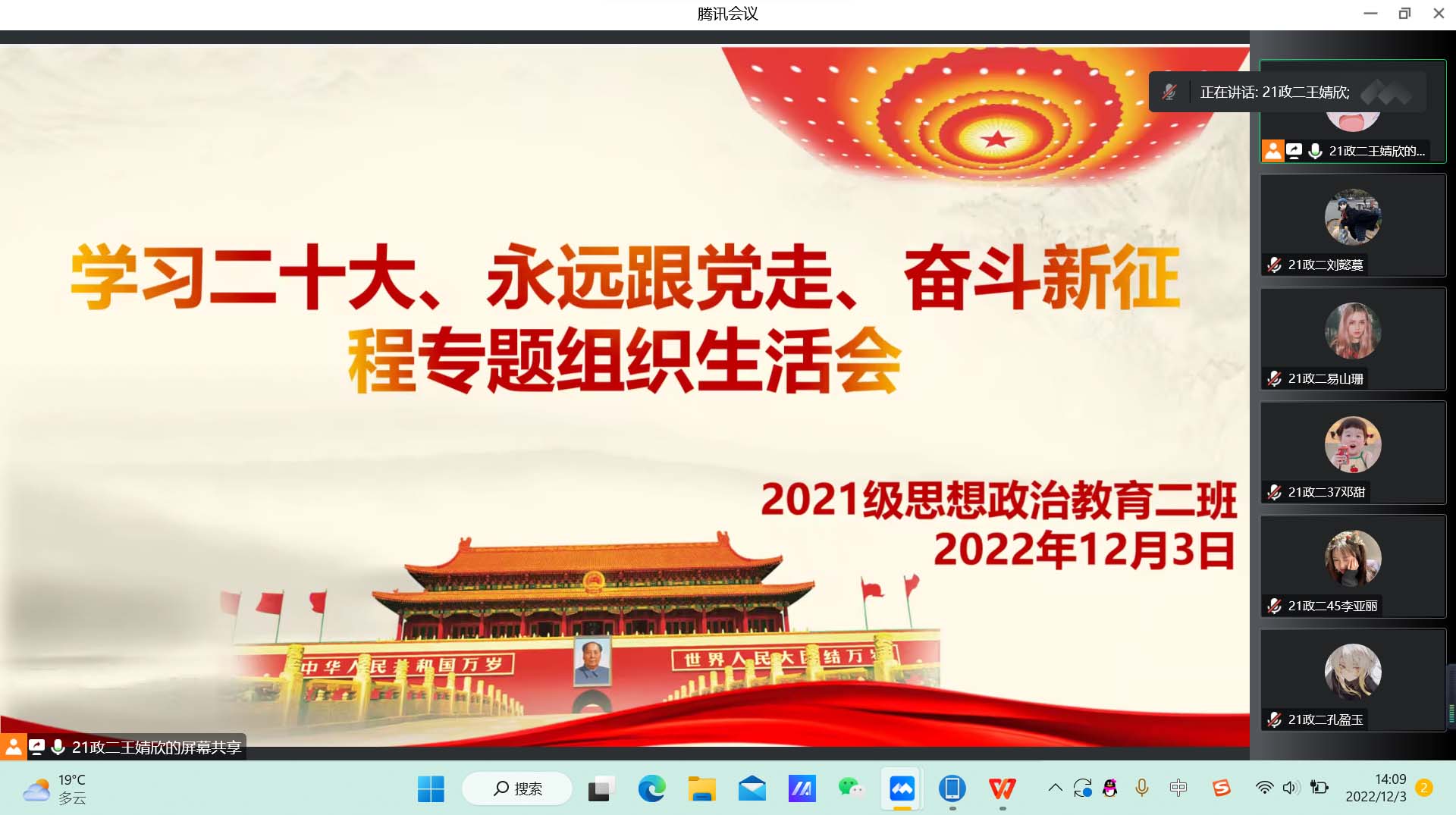12月3日下午,永利集团官网2021级思想政治教育二班团支部在腾讯会议召开学习二十大、永远跟党走、奋进新征程专题组织生活会。2021级思想政治教育二班全体团员参加此次组织生活会。组织生活会由团支书王婧欣主持。