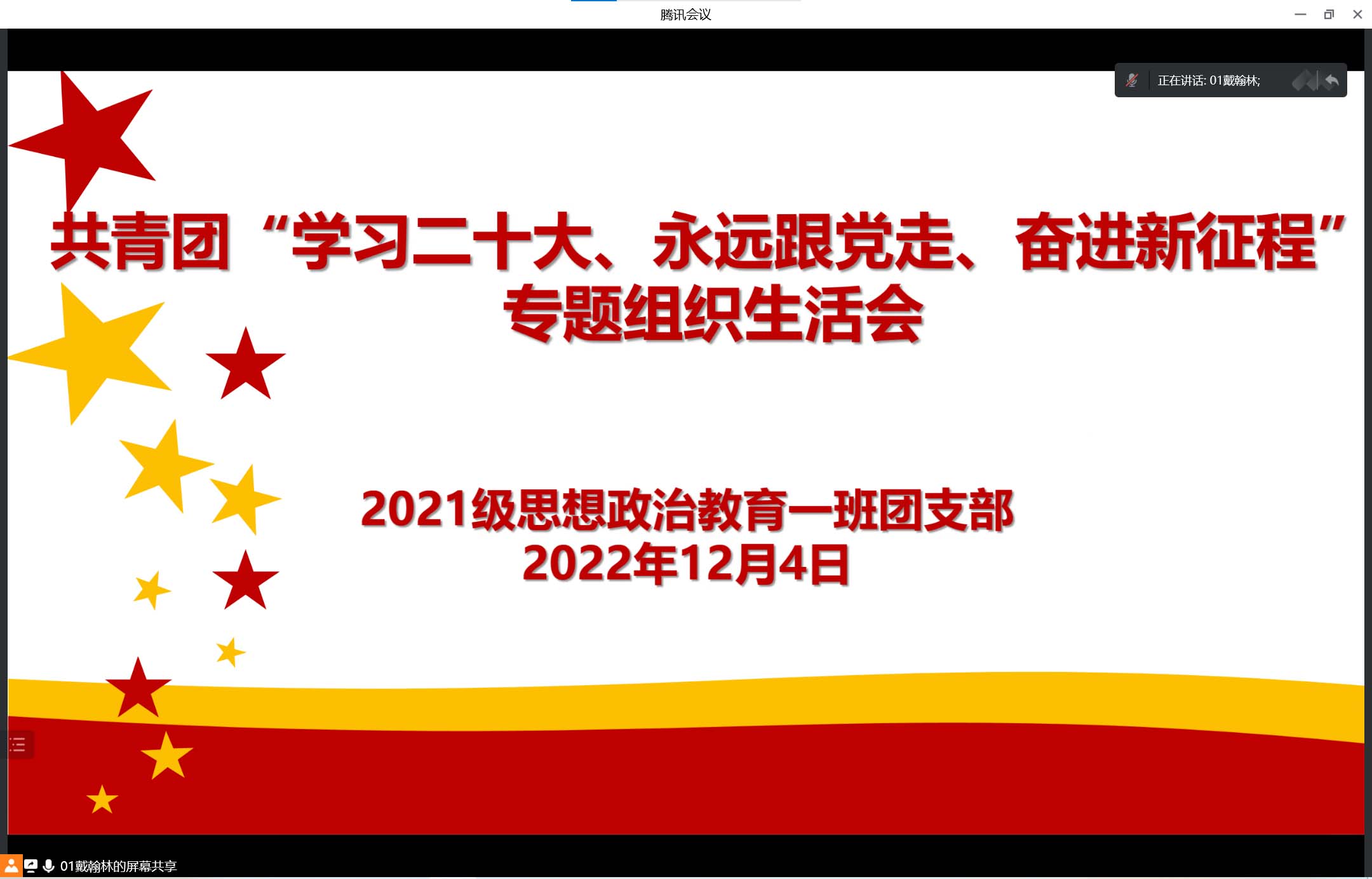 12月4日下午,永利集团官网2021级思想政治教育一班团支部在腾讯会议召开线上“学习二十大、永远跟党走、奋进新征程”专题组织生活会。2021级思想政治教育一班全体团员参加了本次大会。会议由团支书戴翰林主持。
