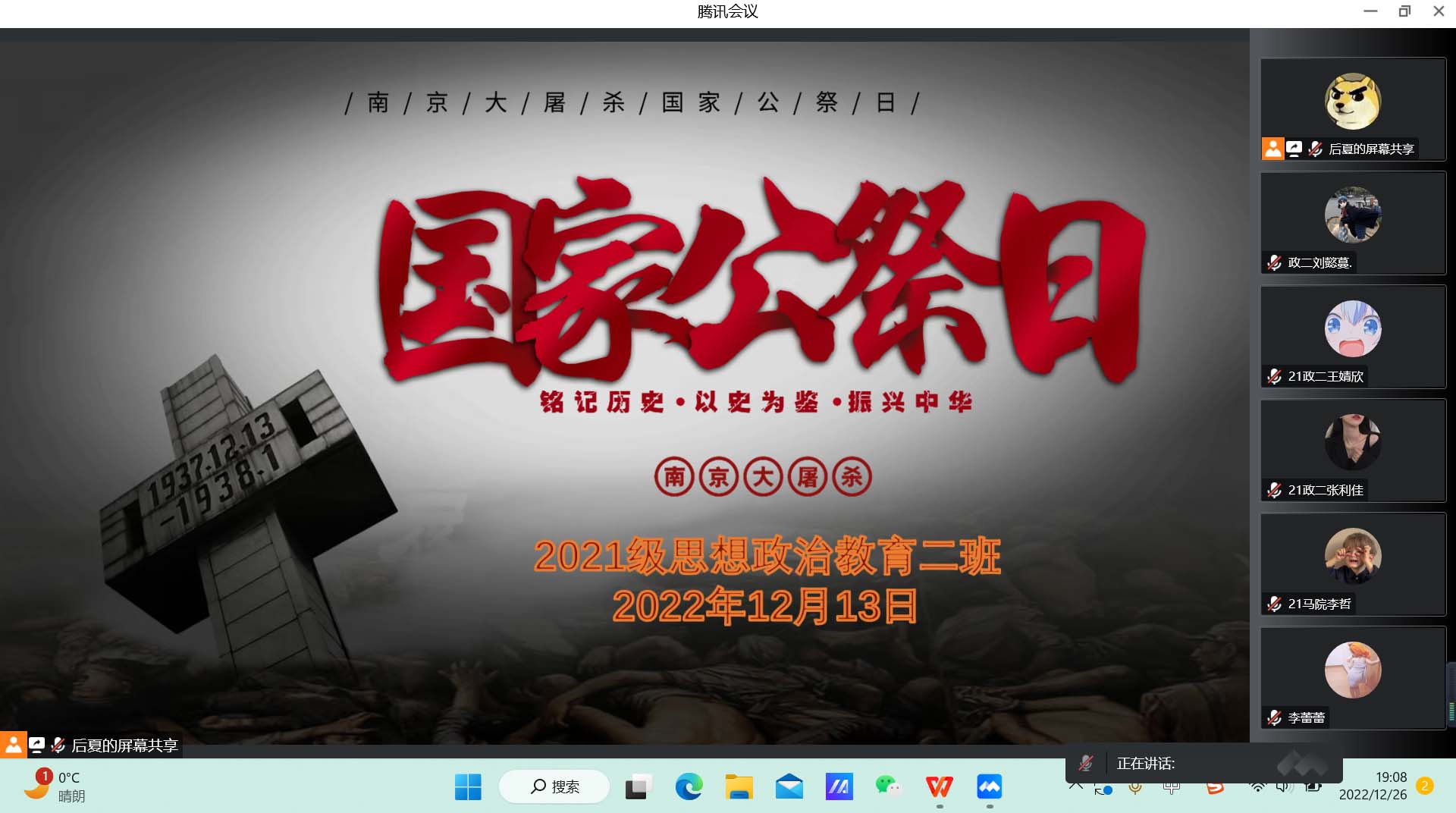 12月13日下午,永利集团官网2021级思想政治教育二班在腾讯会议召开“铭记历史·以史为鉴·振兴中华”国家公祭日主题班会。2021级思想政治教育二班全体成员共同参加此次班会。班会由团支书王婧欣主持。