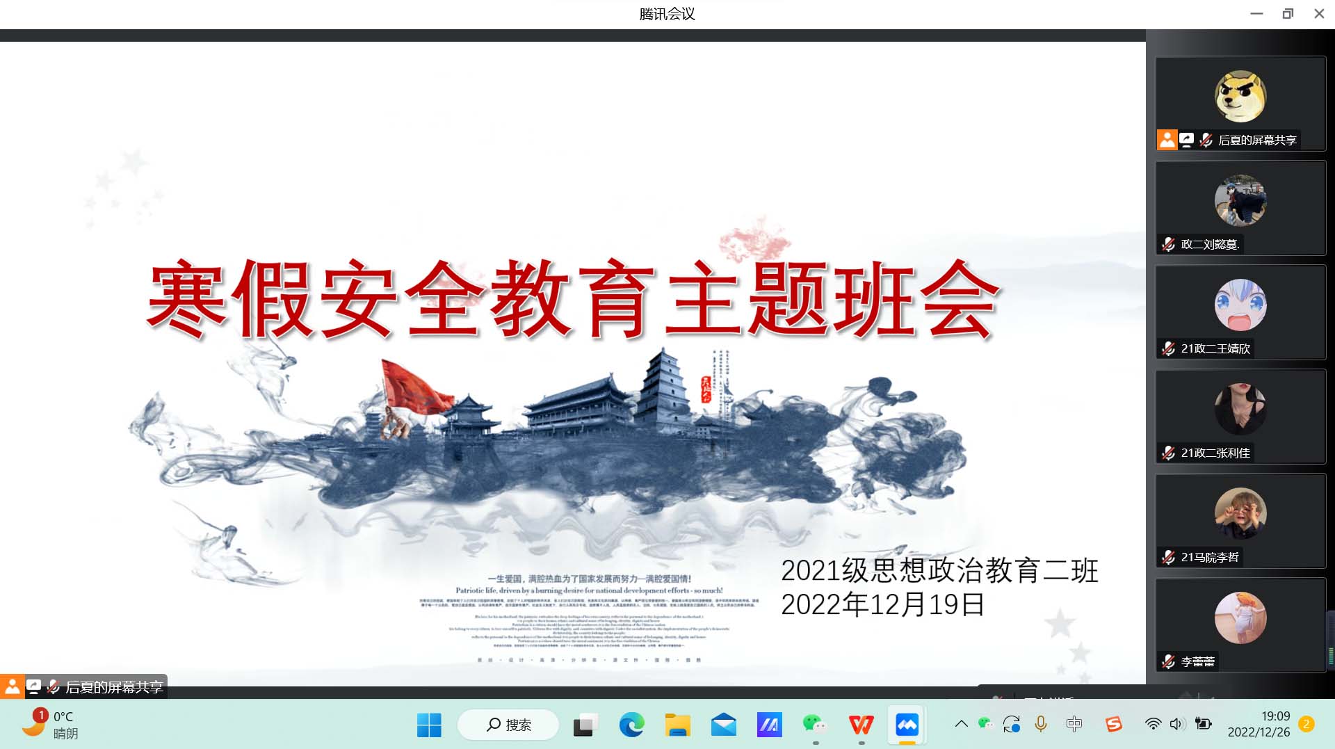 12月19日下午,永利集团官网2021级思想政治教育二班在腾讯会议召开寒假安全教育主题班会。2021级思想政治教育二班全体成员共同参加此次主题班会。班会由副班长任振豪主持。