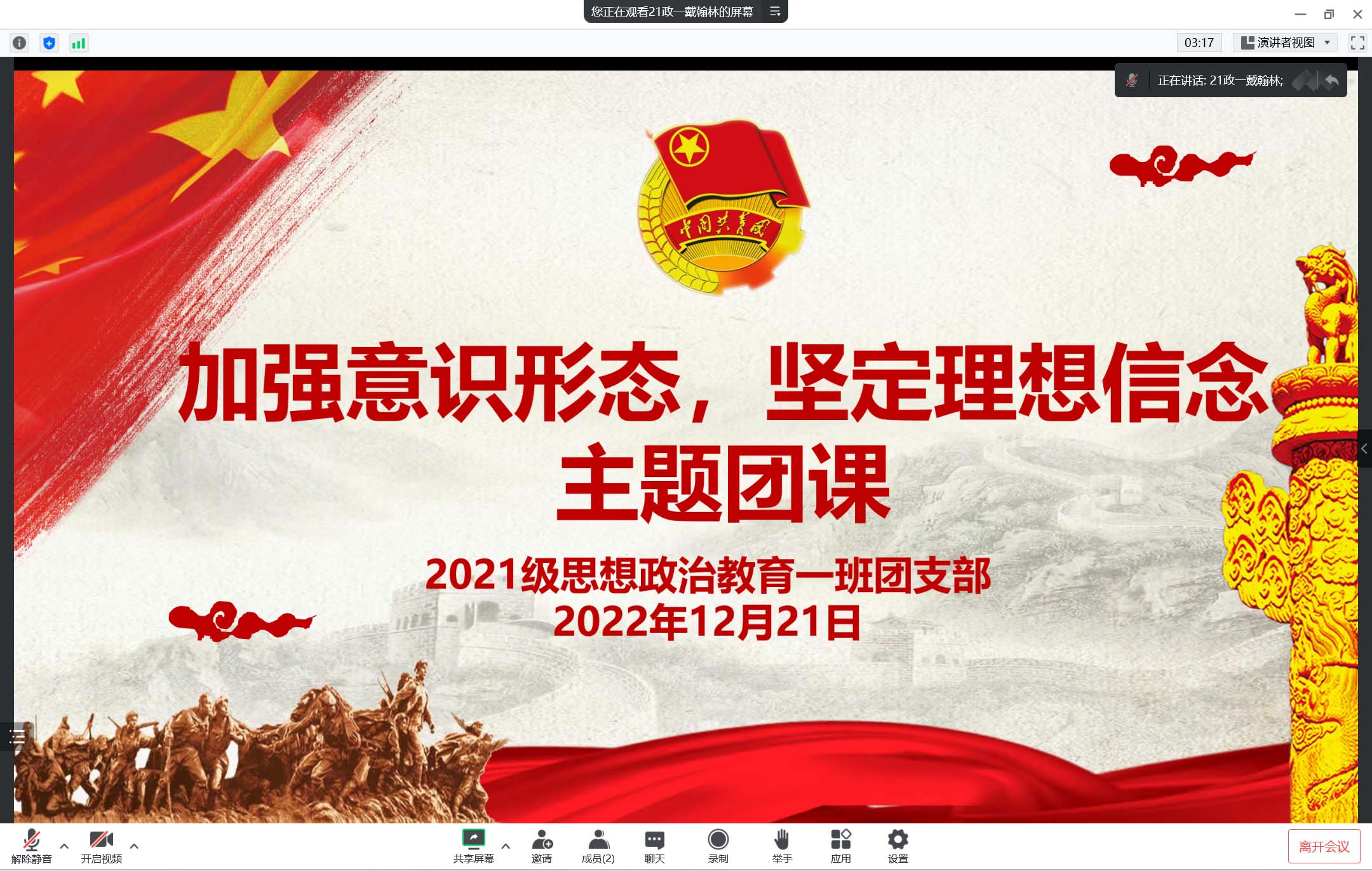 12月21日下午,永利集团官网2021级思想政治教育一班在腾讯会议召开线上“加强意识形态,坚定理想信念”主题团课。2021级思想政治教育一班全体团员参加了本次团课。团课由团支书戴翰林主持。