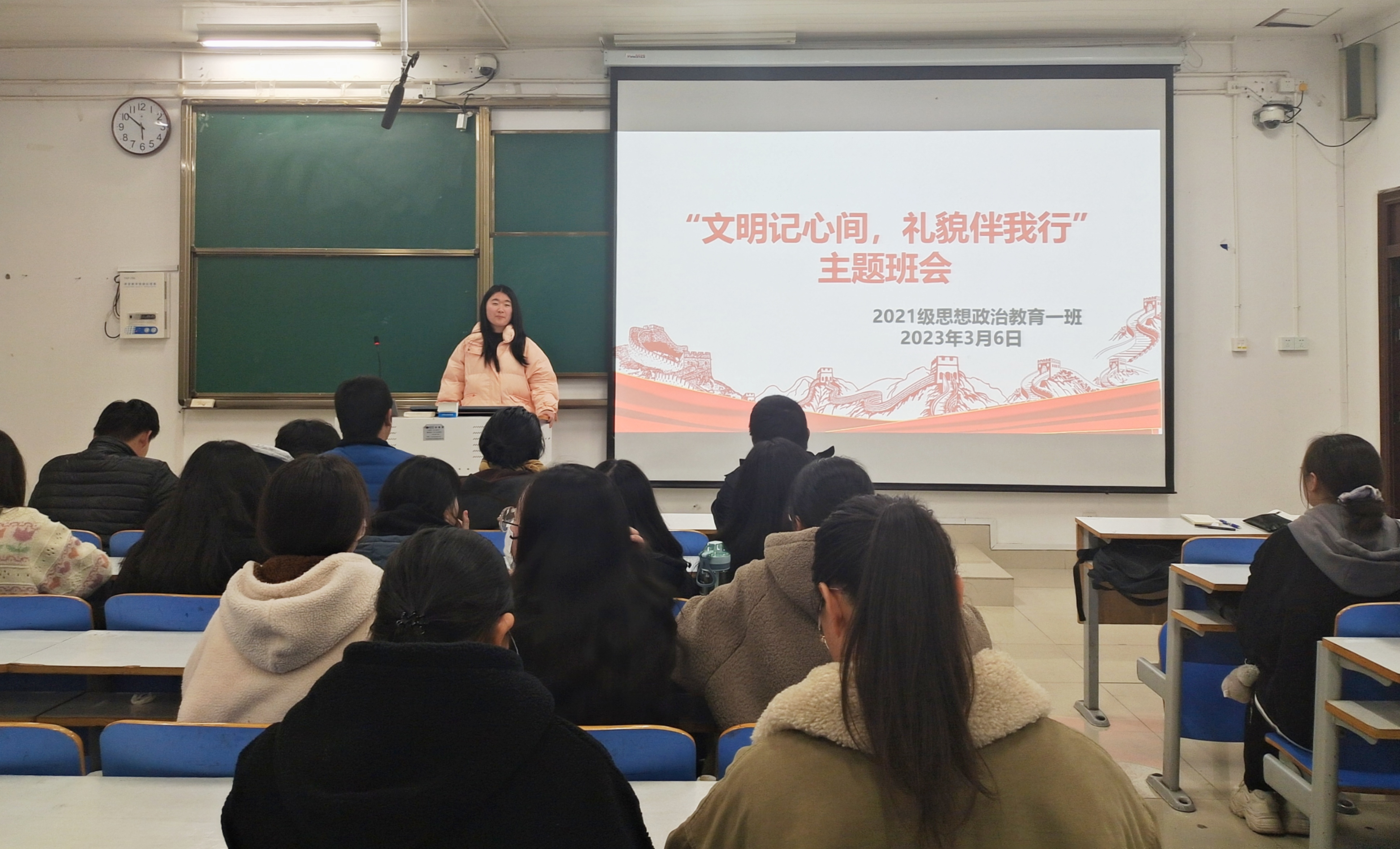 为加强校园文明建设,增强学生文明意识,营造文明、和谐的育人环境。3月6日下午,永利集团官网2021级思想政治教育一班在社科楼514教室召开“文明记心间,礼貌伴我行”主题班会。2021级思想政治教育一班全体成员共同参与本次班会。班会由副班长雷敏主持。