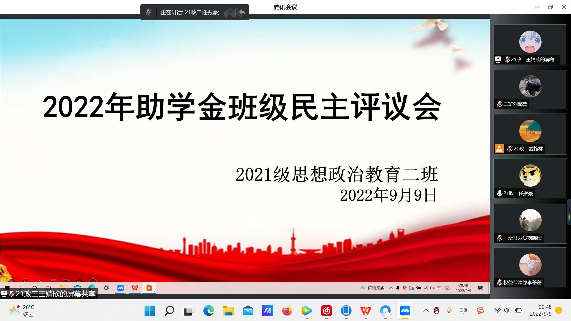 9月9日晚上,永利集团官网2021级思想政治教育二班在腾讯会议召开线上2022年助学金班级民主评议会。2021级思想政治教育二班评议小组成员及辅导员曹菁菁参加此次会议。会议由团支书王婧欣主持。
