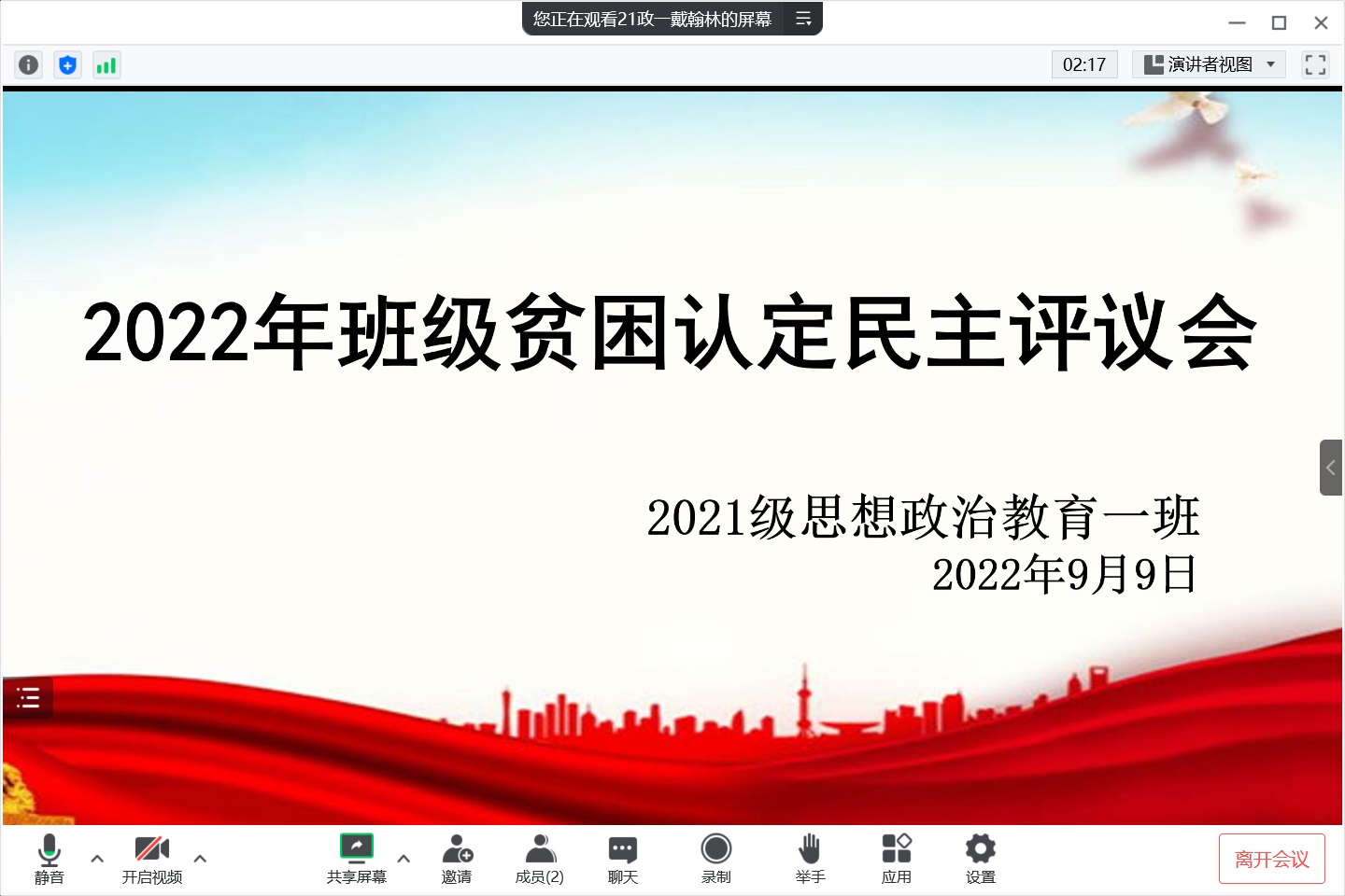 9月9晚上,永利集团官网2021级思想政治教育一班在腾讯会议召开线上2022年班级贫困认定民主评议会。评议会由辅导员曹菁菁、学生会权益保障部成员及2021级思想政治教育二班评议小组成员参加。评议会由班长戴翰林主持。