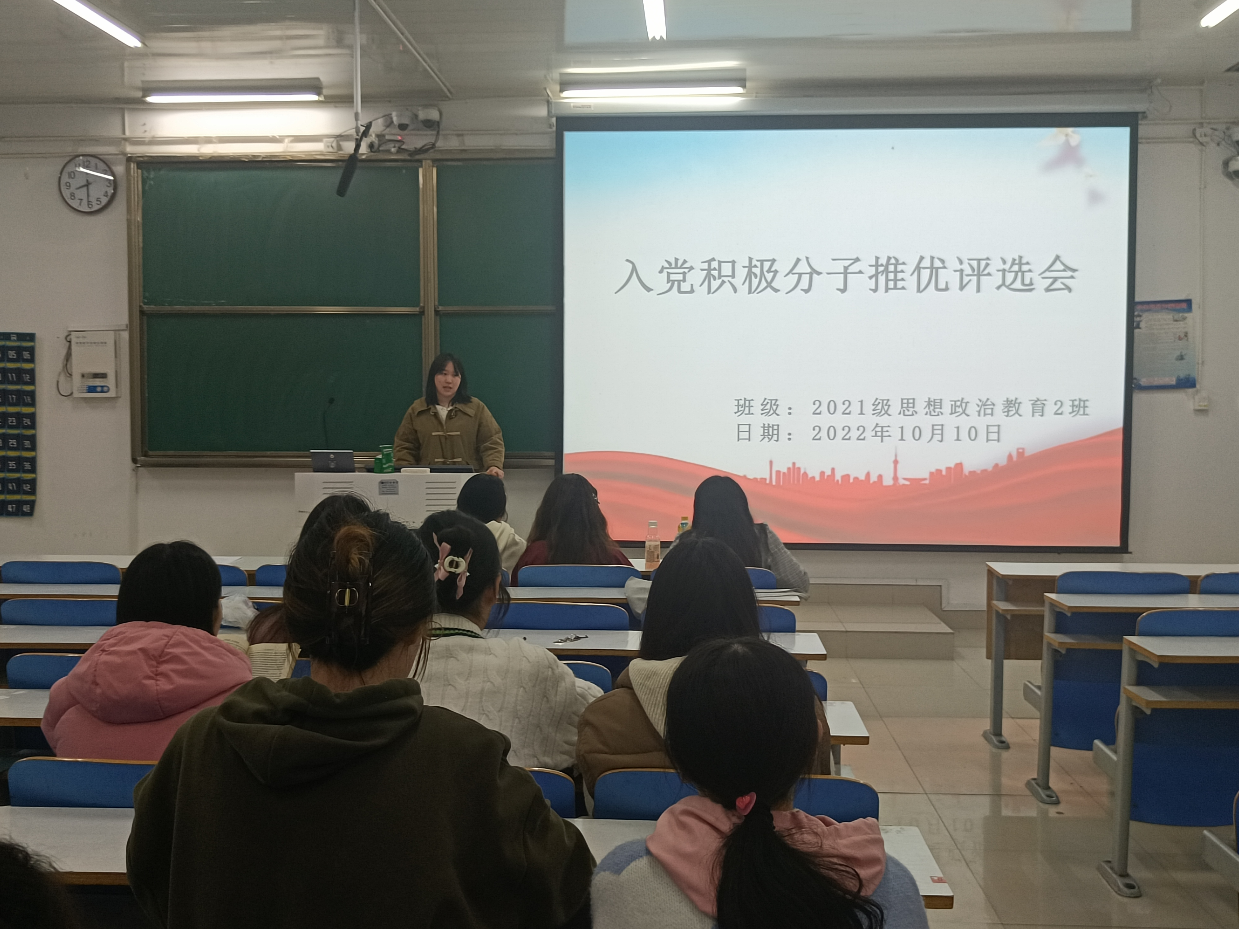 10月10日上午,永利集团官网2021级思想政治教育二班在社科楼514教室召开入党积极分子推优评选会。2021级思想政治教育二班全体成员参加此次评选会。评选会由团支书王婧欣主持。