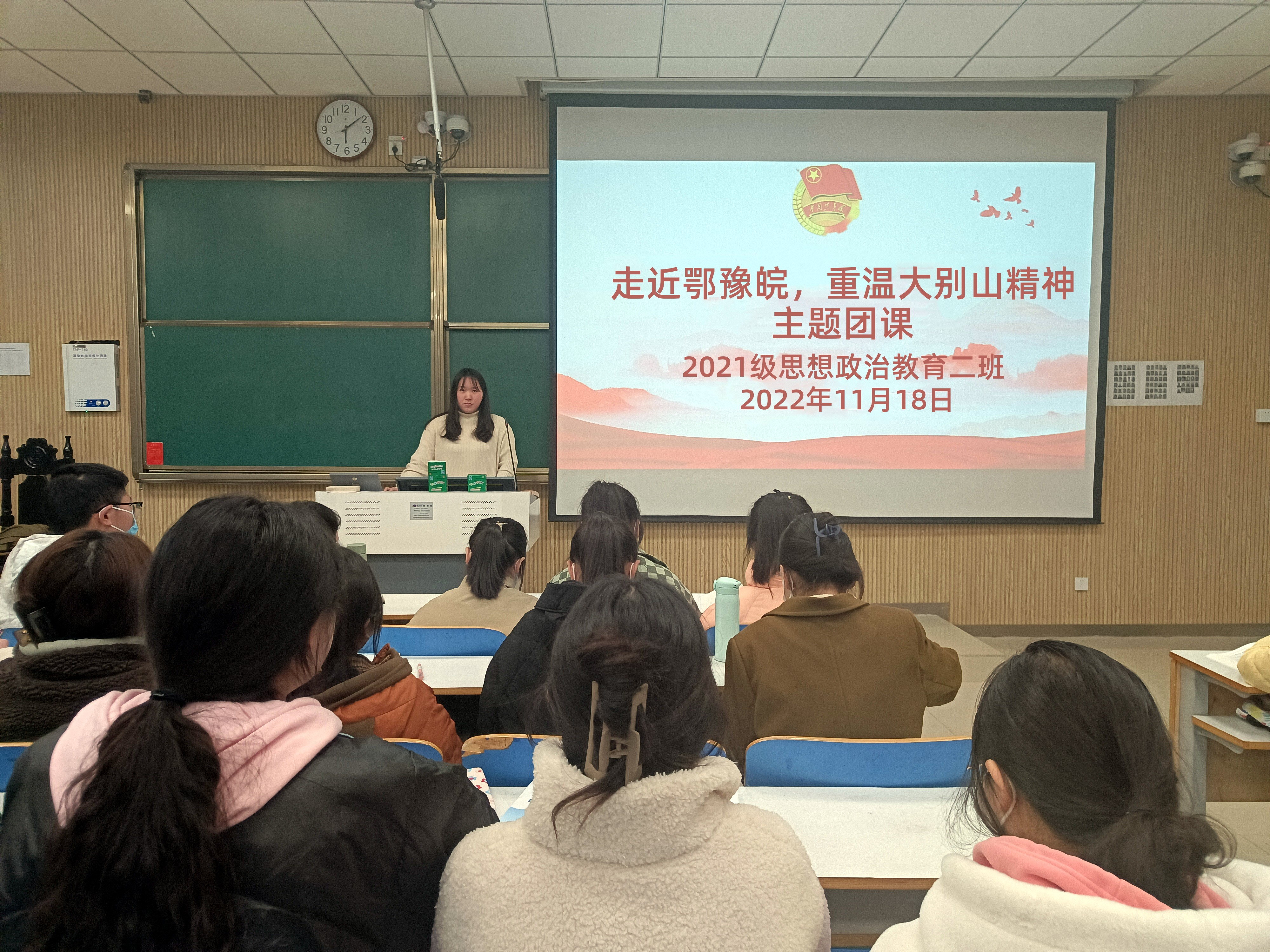 11月18日下午,永利集团官网2021级思想政治教育二班在社科楼514教室召开“走近鄂豫皖,重温大别山精神”主题团课。2021级思想政治教育二班全体团员共同参加此次团课。团课由团支书王婧欣主持。