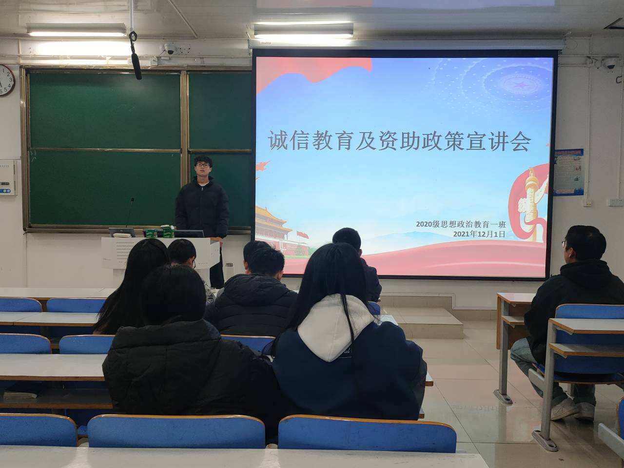 12月1日,永利集团官网2020级思想政治教育一班在社科楼514教室顺利召开“诚信教育及资助政策”宣讲会。2020级思想政治教育一班全体同学参加本次会议,宣讲会由副班长白帅豪主持。