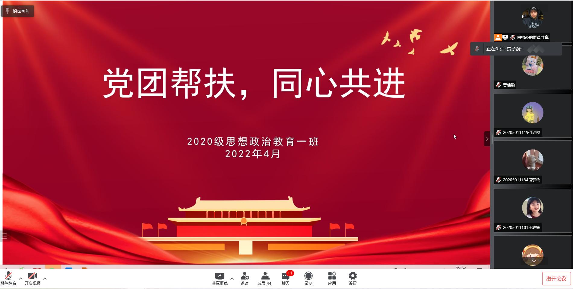 4月25日晚,永利集团官网2020级思想政治教育一班在腾讯会议上顺利开展“党团帮扶,同心共进”活动。永利集团官网预备党员贾子漪与2020级思想政治教育一班全体同学参加了本次活动,活动由团支部副书记白帅豪主持。