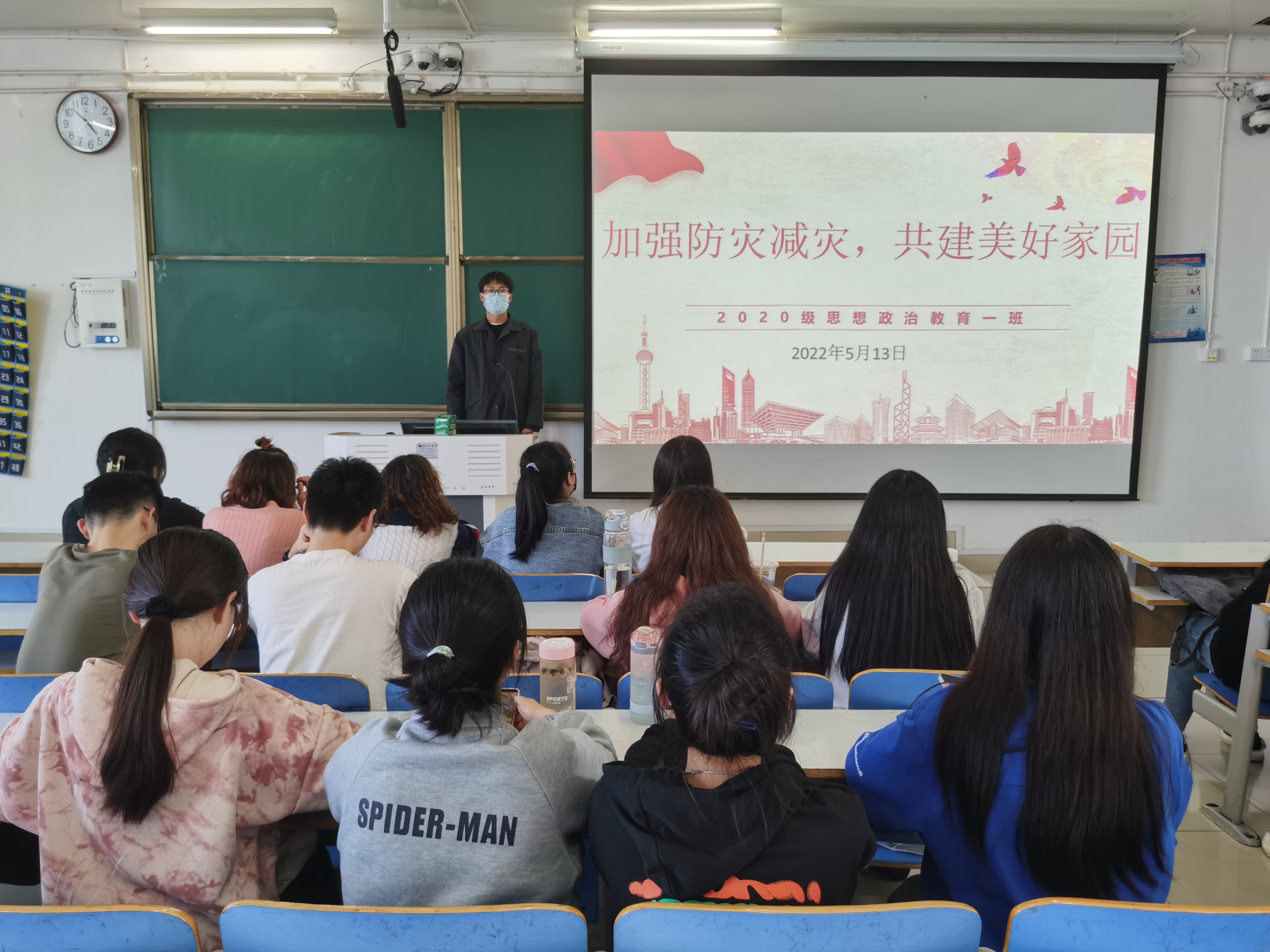 班会伊始,白帅豪通过PPT介绍了首个防灾减灾日的相关知识,并指出我国是世界上自然灾害最为严重的国家之一,灾害种类多、分布地域广、发生频率高、造成损失重。随后,白帅豪带领同学们一起观看了一段汶川地震的视频,使同学们认识到防灾减灾在生活中的重要性。接着,他讲述在遇到各种灾难时应当注意的一些问题,例如:地震时高楼不要搭电梯,遇到火灾时要逆风匍匐潜行等,同学们了解到常见灾害及预防自救自护知识。最后,白帅豪强调,当代大学生应加强对防灾减灾知识的学习,用实践共建美好家园。