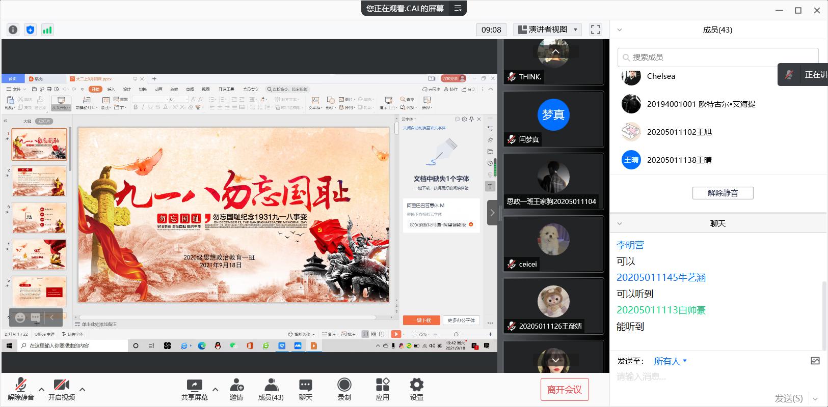 9月18日,永利集团官网2020级思想政治教育一班在腾讯会议上召开“九一八勿忘国耻”团课。2020级思想政治教育一班全体同学参加此次团课,团课由团支书卢茜雨主持。