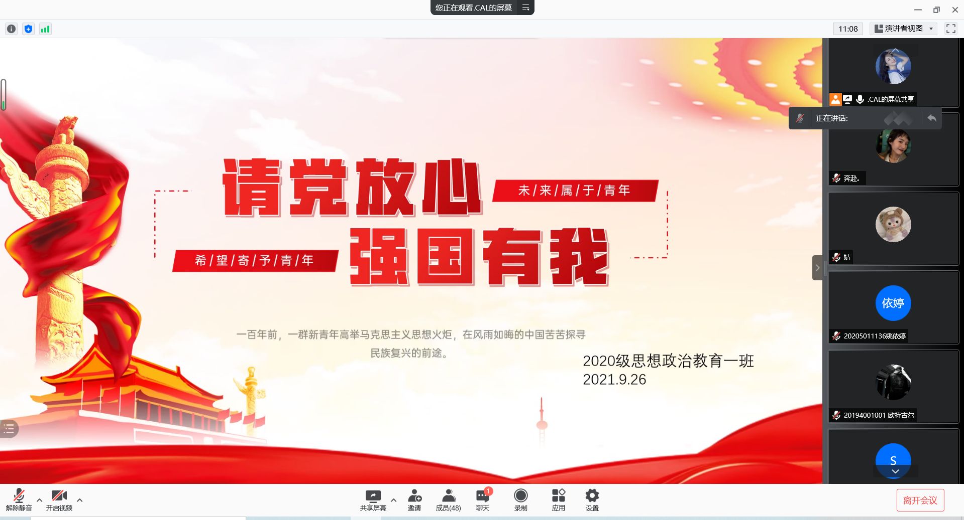 9月26日晚上,永利集团官网2020级思想政治教育一班在腾讯会议上召开主题为“请党放心,强国有我”的团支部大会。2020级思想政治教育一班全体同学全程参加本次团支部大会,大会由团支书卢茜雨主持。