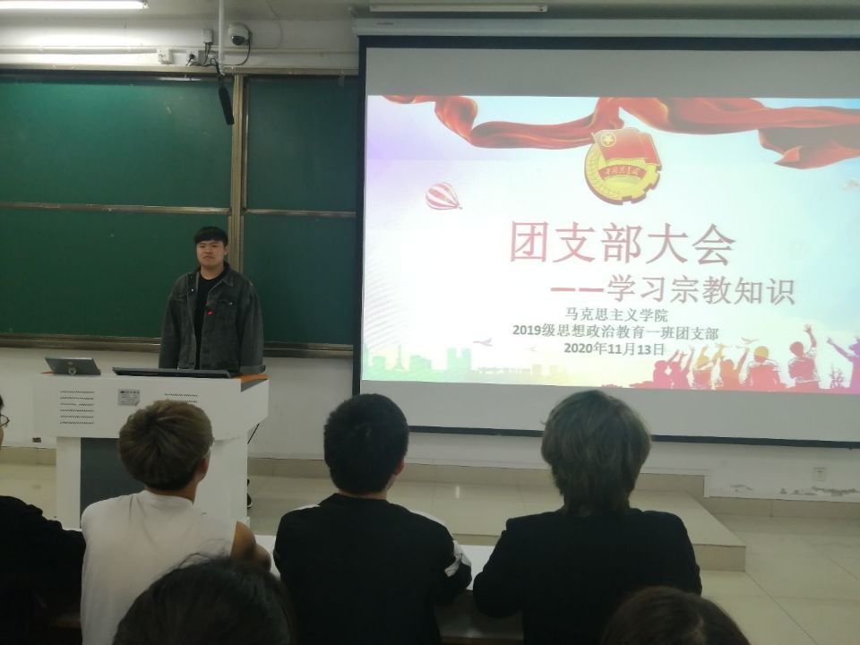 11月13日下午,永利集团官网2019级思想政治教育一班第一团支部在社科楼515教室召开“学习宗教知识”团支部大会。永利集团官网2019级思想政治教育一班全体成员参加本次会议,会议由团支书贾子漪主持。