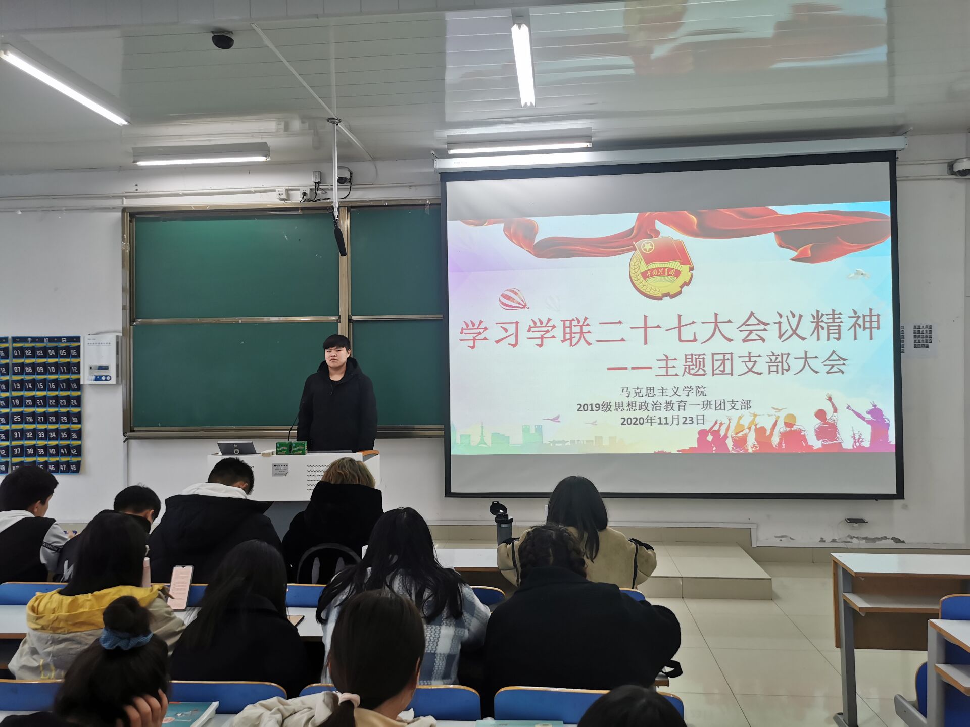 11月23日下午,永利集团官网2019级思想政治教育一班第一团支部在社科楼515教室召开“学习学联二十七大会议精神”主题团支部大会。永利集团官网2019级思想政治教育一班全体成员参加本次会议,会议由团支书贾子漪主持。