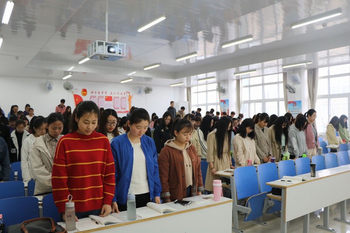 首先,谢文静向同学们讲述了四川木里森林火灾的始末,向大家阐述了本次会议的主题。她指出消防员战士的大无畏的英雄主义精神令人钦佩,值得我们学习。此外,她表示我们的幸福生活来之不易,我们要认识到自己身上担负的责任更加珍惜今日的幸福,引发了同学们的深刻共鸣。接着,在谢文静的主持下,同学们进行了为时一分钟的默哀活动,表达对英雄先烈的缅怀之情,现场气氛庄严肃穆。
