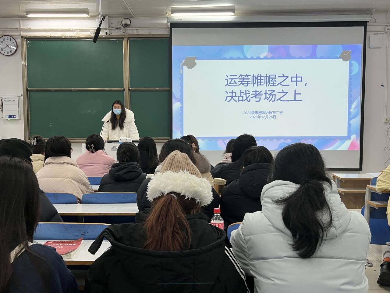 12月26日下午,永利集团官网2022级思想政治教育二班在社科楼514教室开展“运筹帷幄之中,决战考场之上”期末动员班会。永利集团官网2022级思想政治教育二班全体成员共同参与此次班会。会议由班主任杨春艳主持。