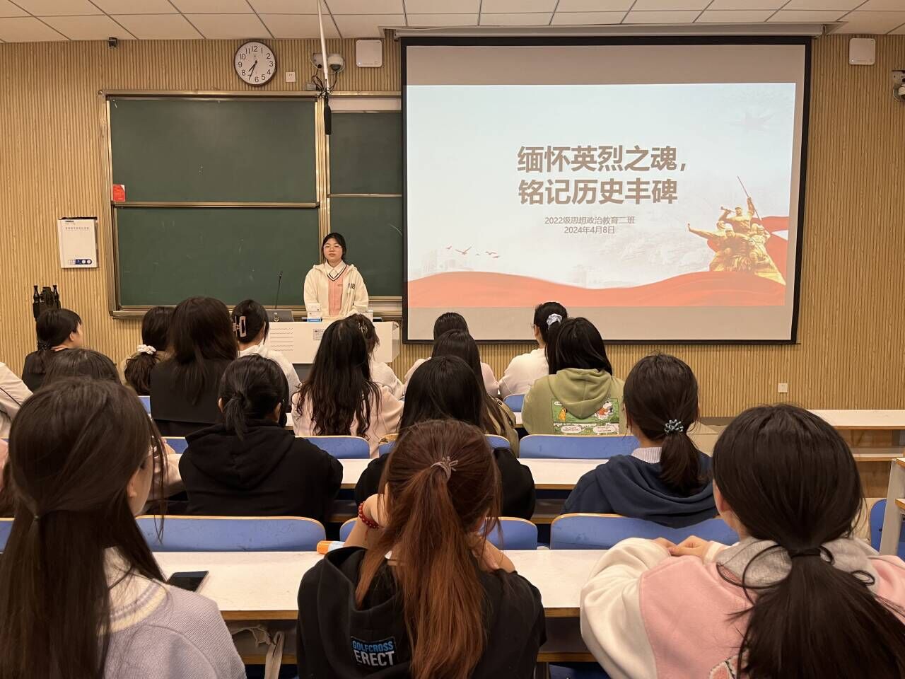 首先,冯伟珈介绍了清明节的由来和意义,向同学们介绍了这个传统节日背后所承载的深厚历史文化内涵。随后,通过讲述革命先烈的英勇事迹、带领大家观看相关视频,让同学们深刻感受到先烈们为了民族独立和人民幸福所付出的巨大牺牲,并号召同学们要珍惜来之不易的幸福生活。最后,宣传委员鲍梦瑶和大家分享自己的感悟,她指出,通过此次班会,自己对清明节背后的深层意义有了进一步的理解,今后会努力传承中华民族传统美德,把缅怀先贤先烈、发扬革命传统的情怀化作爱党爱国爱社会主义的热情和建设祖国的实际行动。