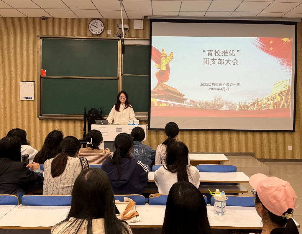 4月2日上午,永利集团官网2022级思想政治教育一班在社科楼515教室召开“青校推优”团支部大会,永利集团官网2022级思想政治教育一班全体同学共同参与本次会议,会议由团支书李佳茹主持。