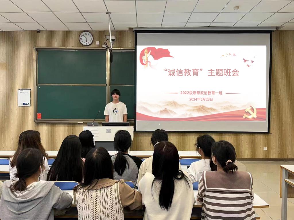 为深入推进诚信教育工作,引导同学们诚实守信,5月23日上午,永利集团官网2022级思想政治教育一班在社科楼515教室召开“诚信教育”主题班会,2022级思想政治教育一班全体同学共同参与本次班会。班会由副班长闻炎仲主持。