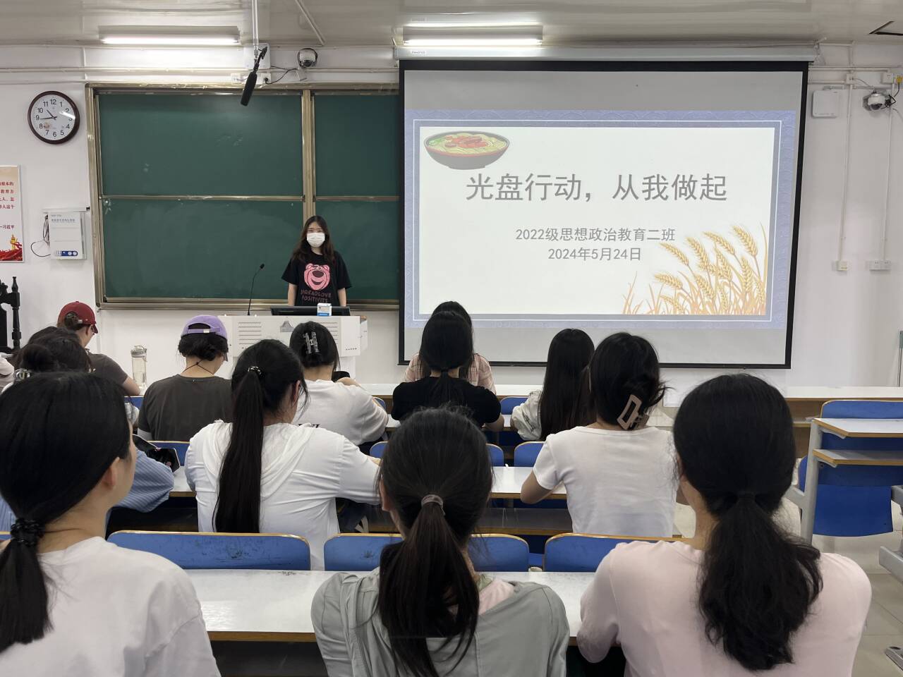 5月24日上午,永利集团官网2022级思想政治教育二班在社科楼514教室召开“光盘行动,从我做起”主题心理班会。永利集团官网2022级思想政治教育二班全体成员共同参与此次班会。班会由心理委员张嘉芮主持。