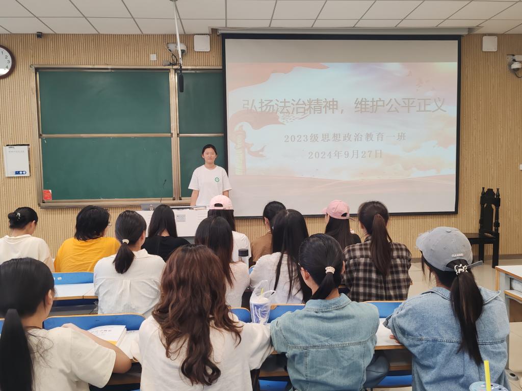 为弘扬宪法精神,增强法制意识,9月27日上午,永利集团官网2023级思想政治教育一班在社科楼515教室召开“弘扬法治精神,维护公平正义”主题团课。2023级思想政治教育一班全体同学参与本次团课,团课由团支书张卓主持。